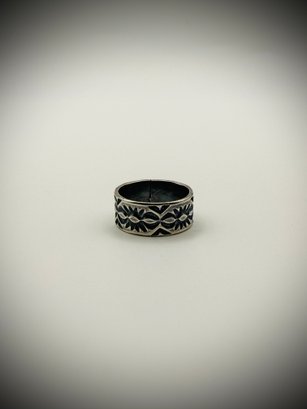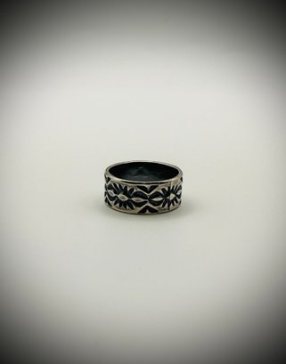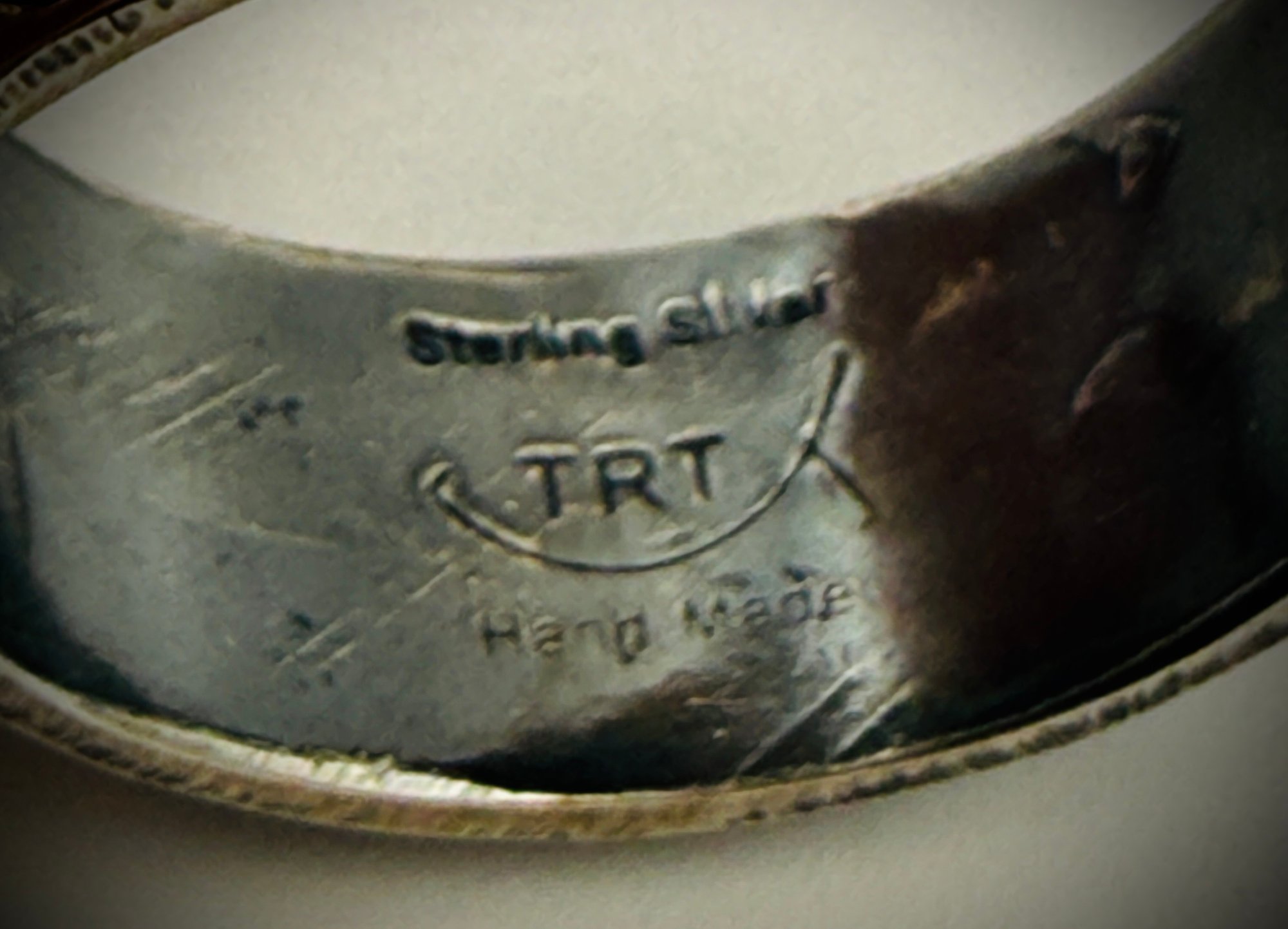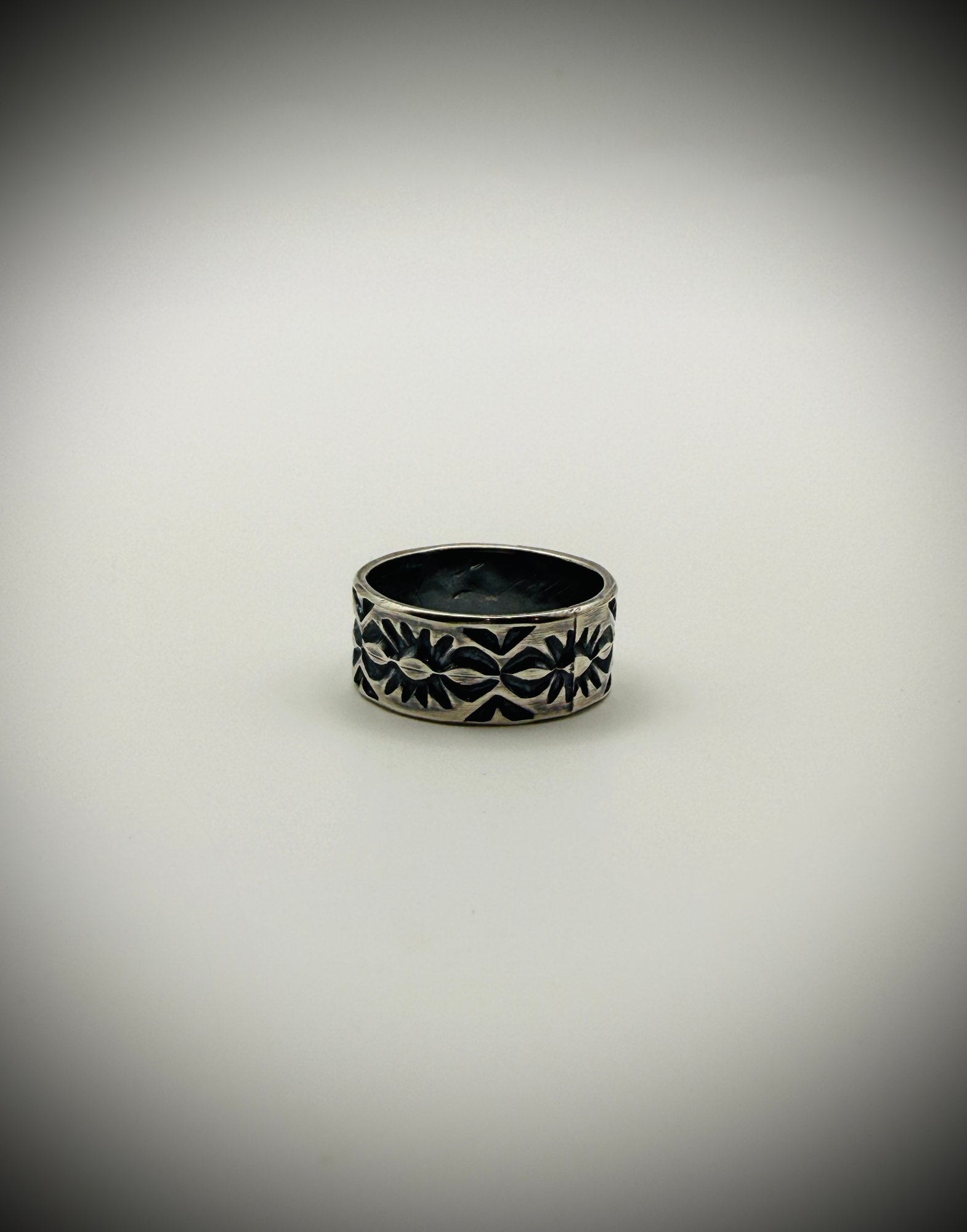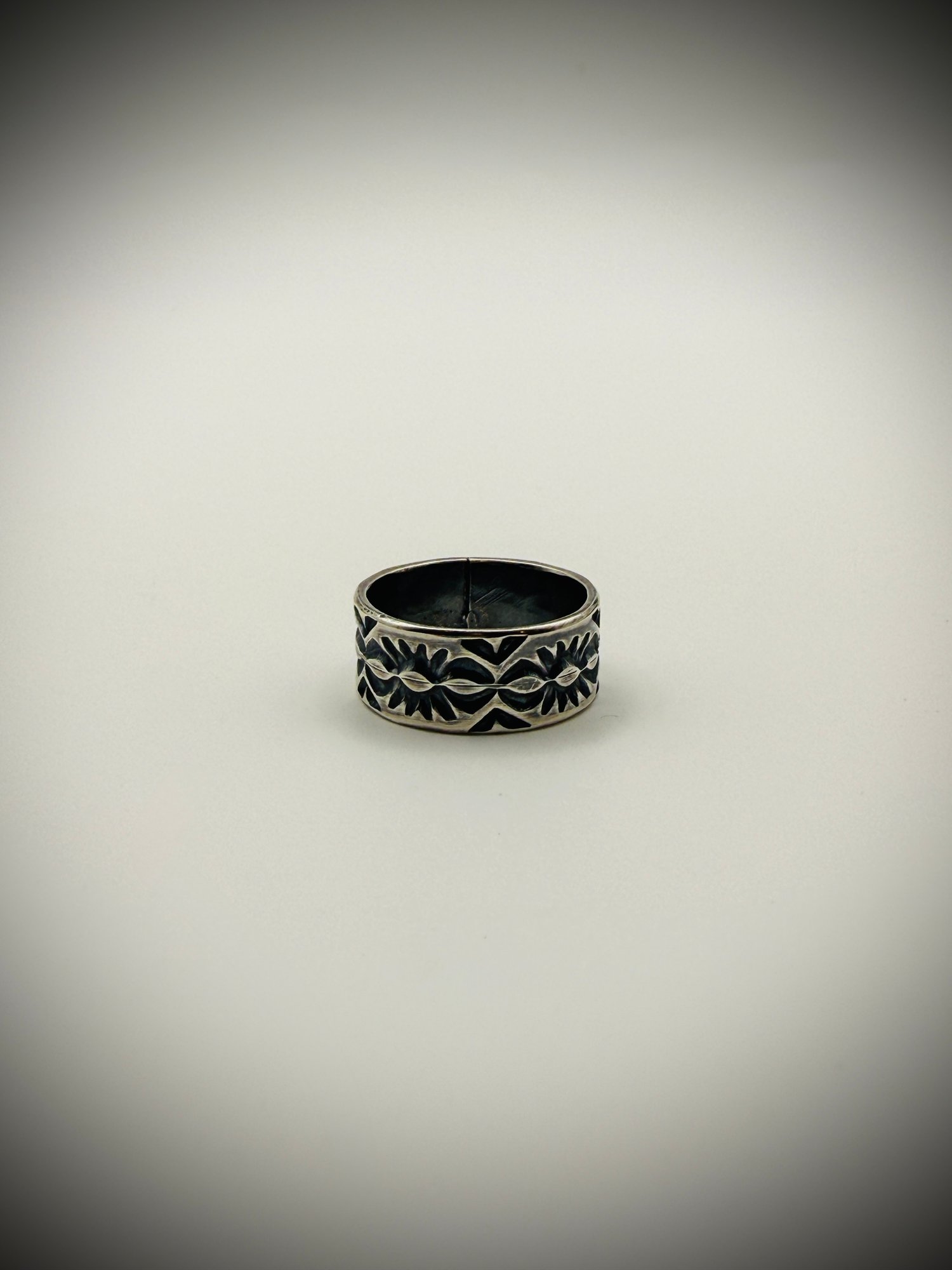Hand-stamped sterling silver band by Travis Teller (Navajo), marked “Sterling” and “TRT Handmade.” Crisp stampwork with rich oxidized backgrounds gives great contrast—perfect as a statement band or stacker.