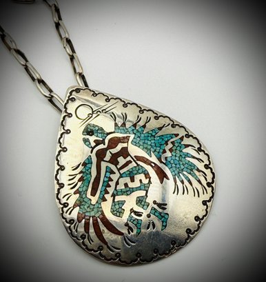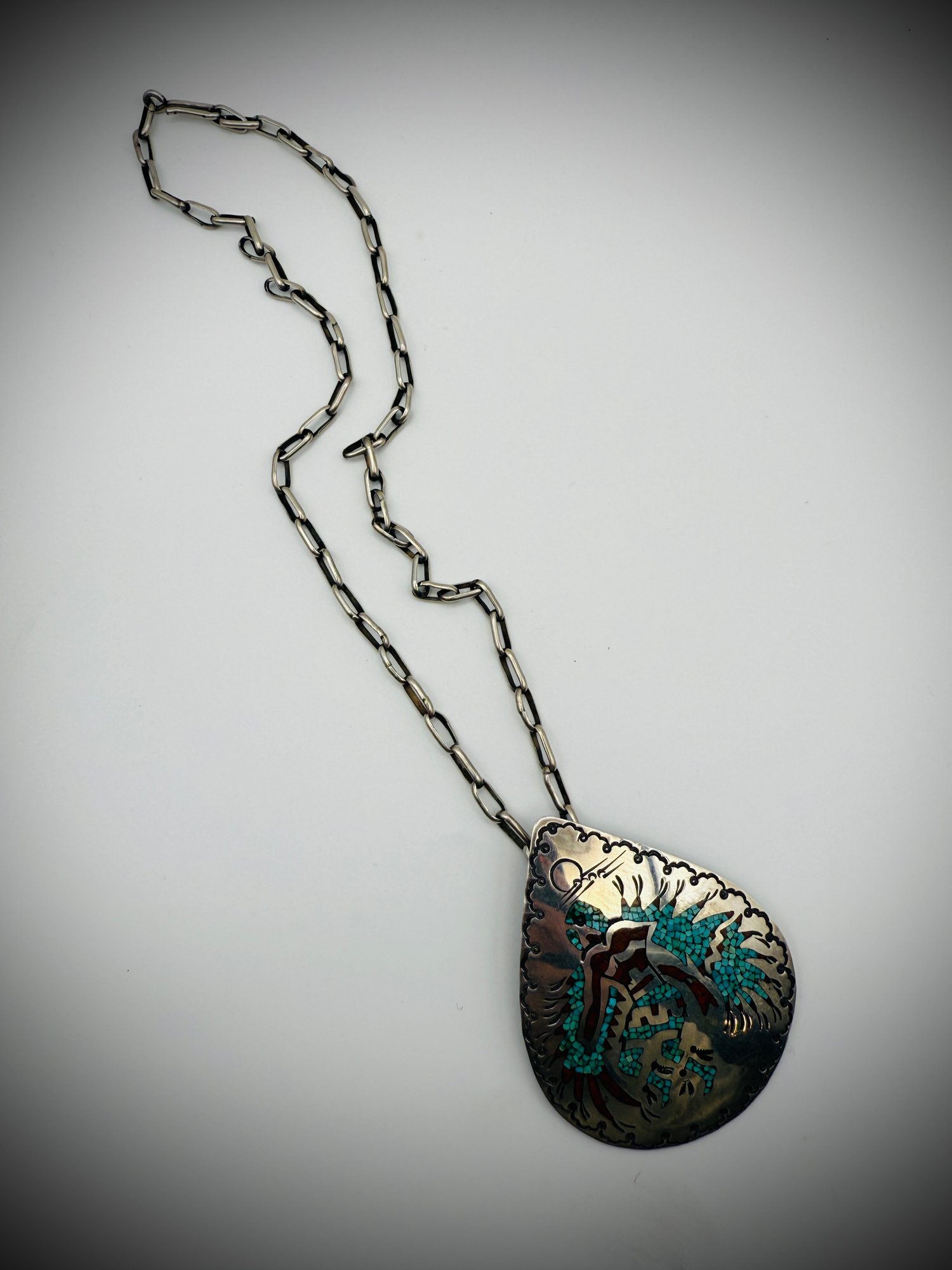 ✨ A collectible vintage Navajo piece that combines artistry and weighty craftsmanship, with both pendant and chain handmade.