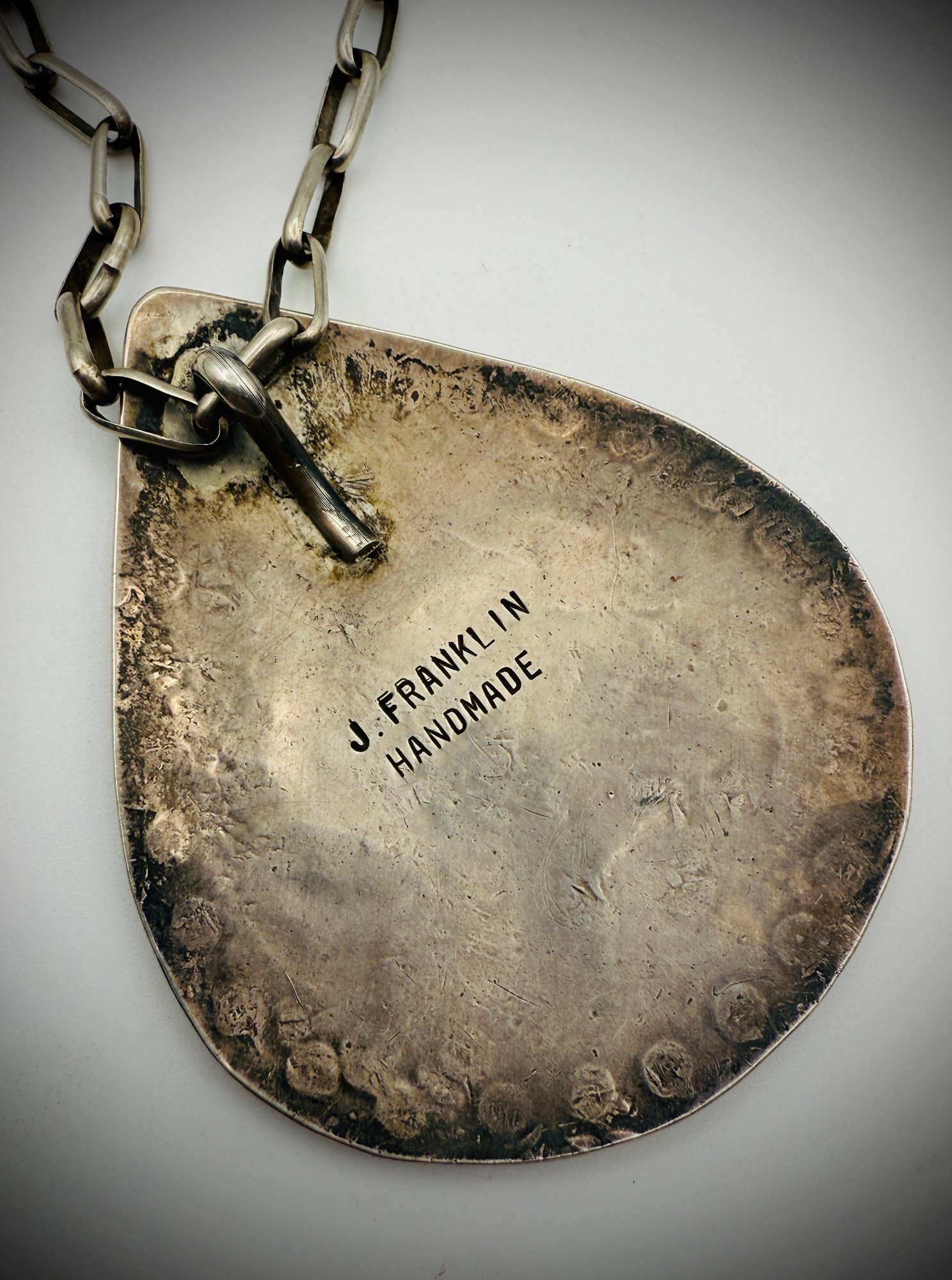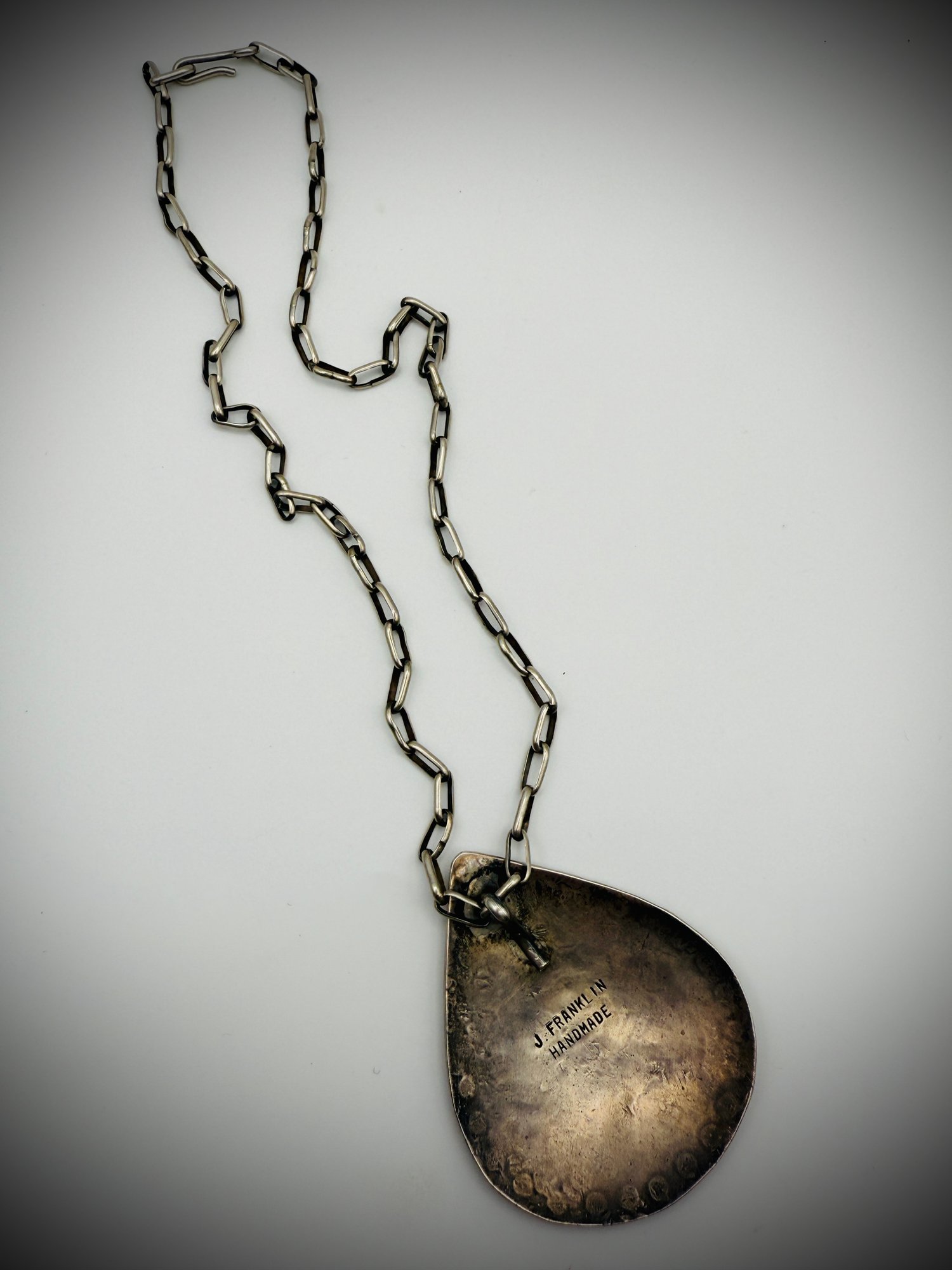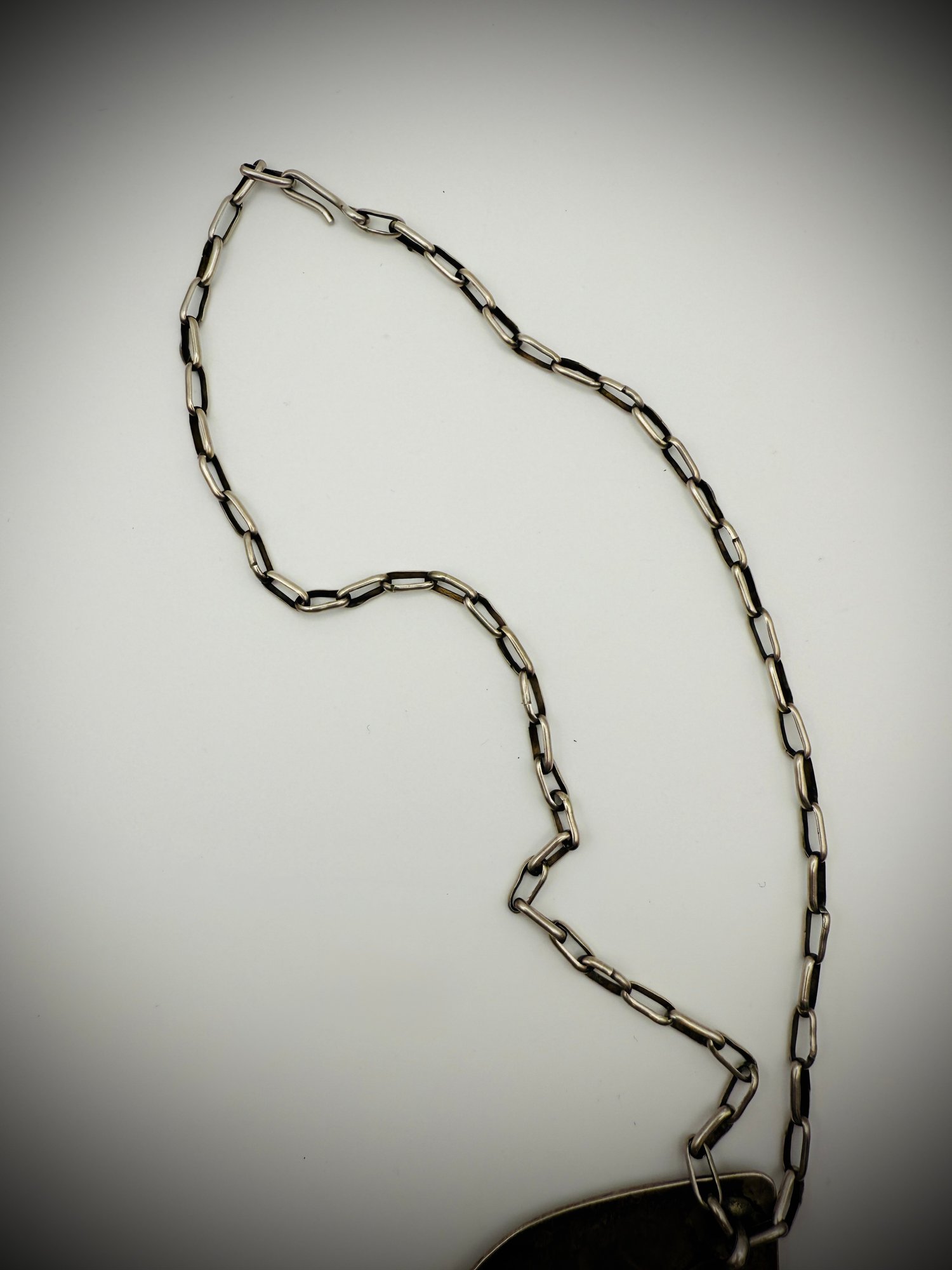 Chain: Substantial handmade sterling silver link chain, approx. 20” long, with a traditional hook-and-eye clasp.