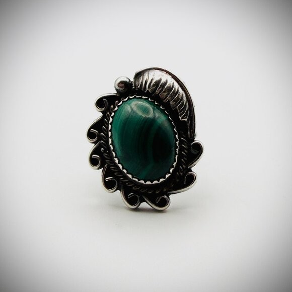 Striking vintage malachite ring featuring a domed green cabochon with classic banding, set in a scalloped bezel and framed by hand-wrought leaf and scroll details. Triple-split shank for balance and comfort.