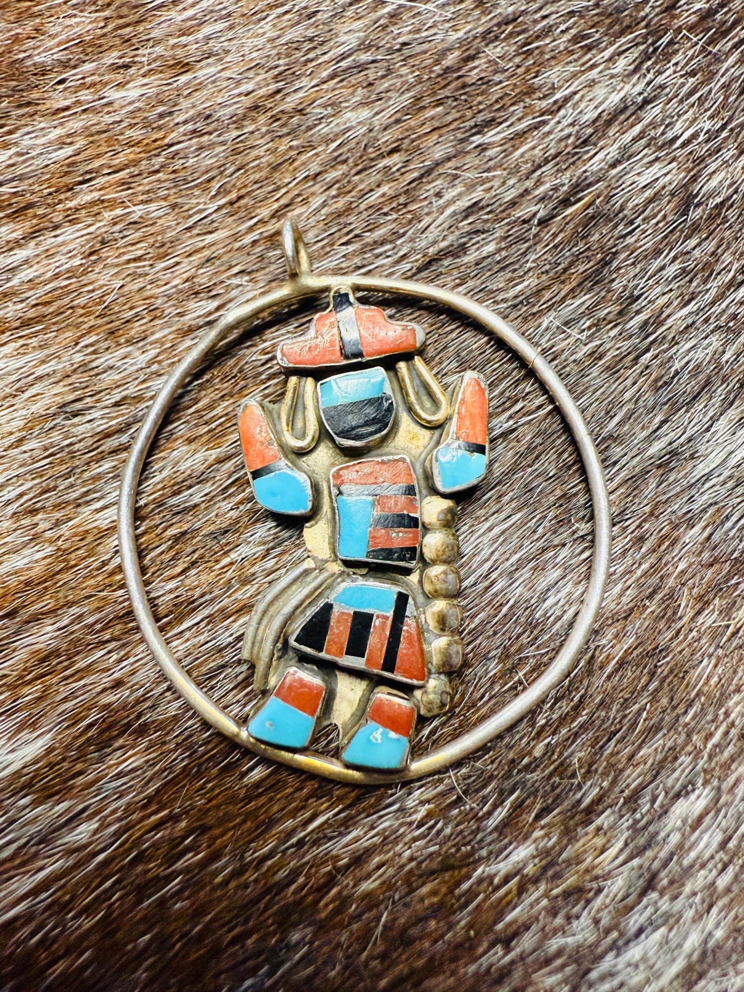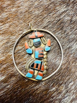 This vintage pendant features a beautifully detailed Zuni kachina dancer figure, possibly representing a Shalako or ceremonial spirit figure, framed within a circular sterling silver setting. The figure is skillfully handcrafted in traditional Zuni mosaic inlay style, using turquoise, coral, jet, and shell.