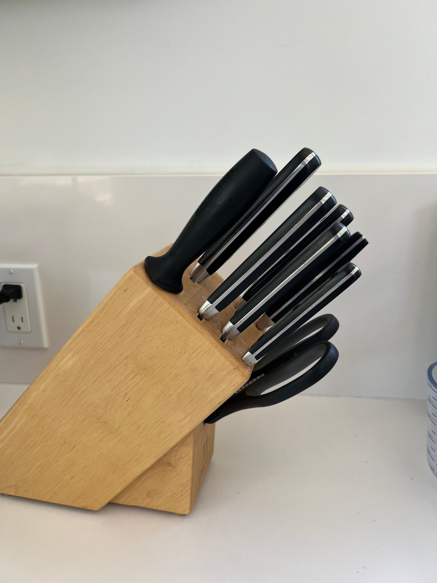 wood block, sheers, sharpening tool, 8" chef knife, bread knife, filet knife, 4"bearing knife and carving knife