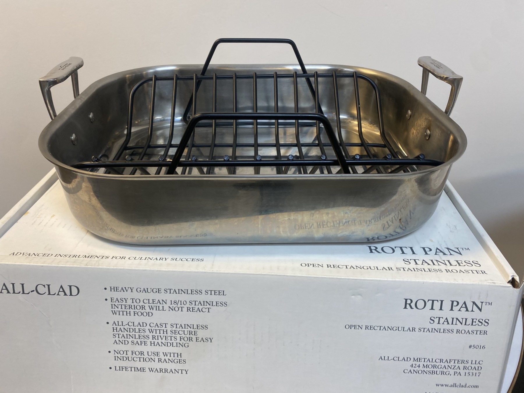 Open rectangular stainless roaster with nonstick roasting rack and turkey forks. Good, used condition.