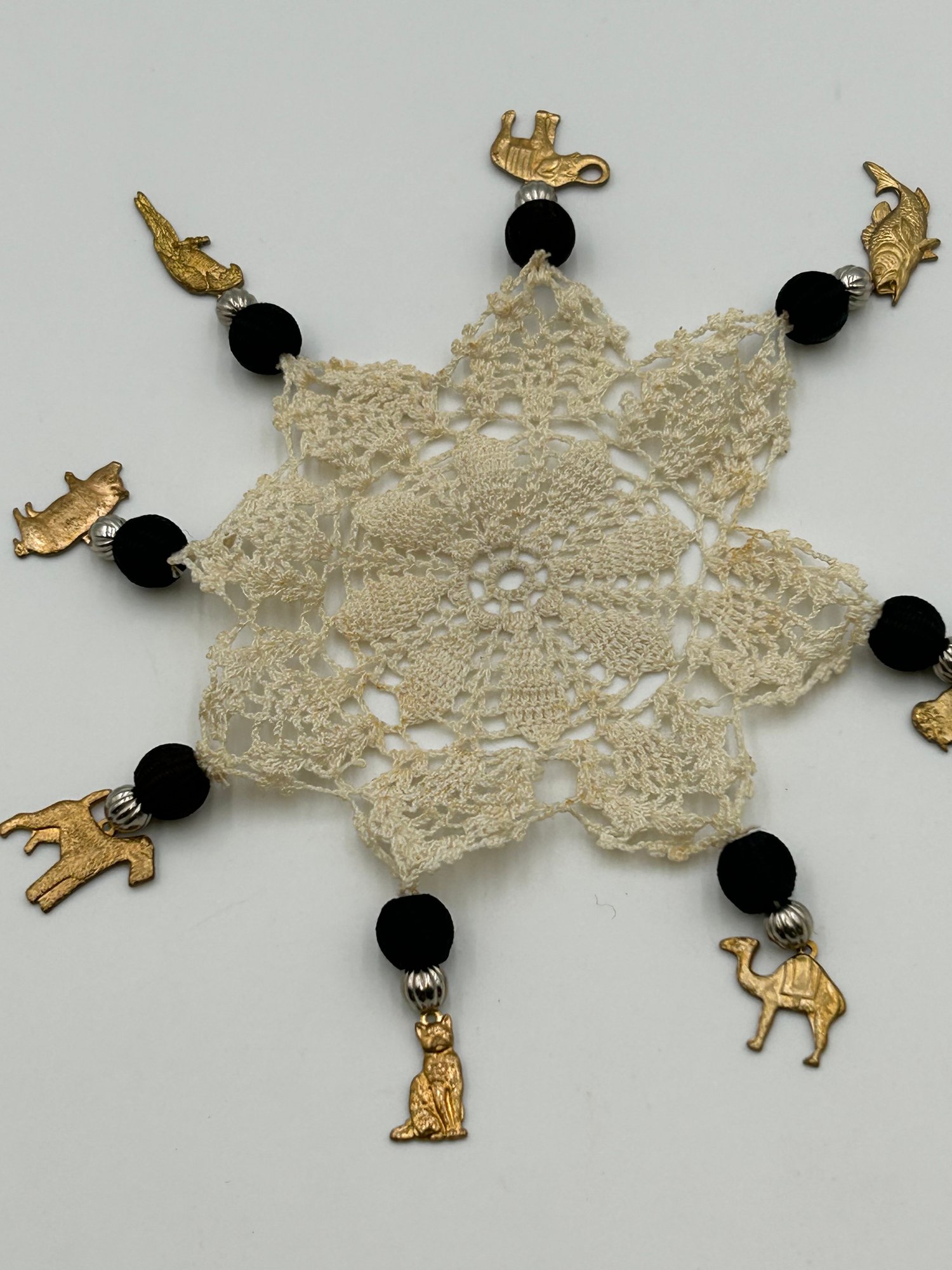 Doily with small brass animals