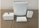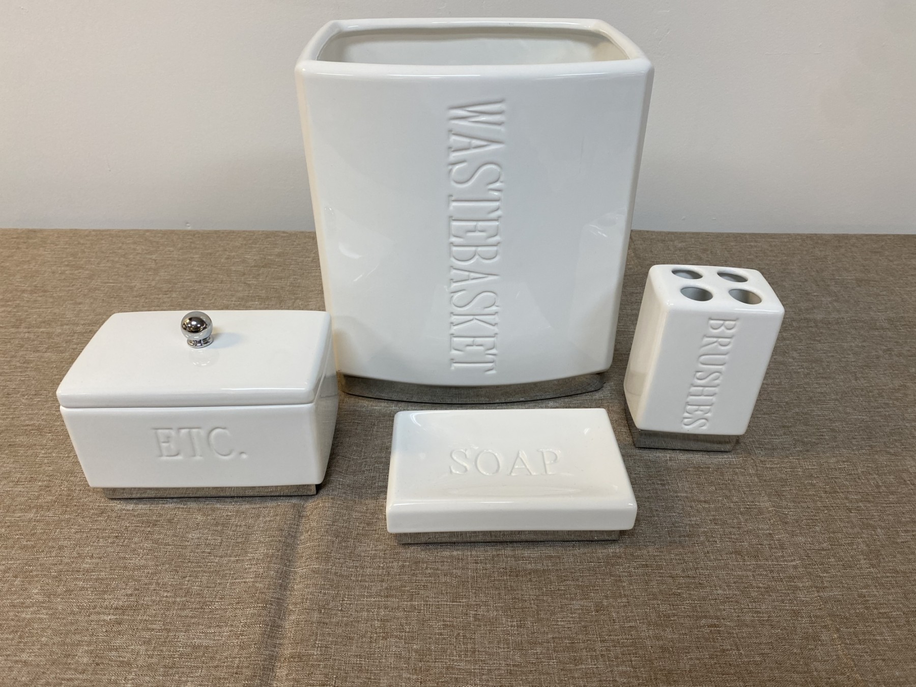 4 ceramic pieces in great condition. Labeled Wastebasket, Soap, Brushes and Etc.