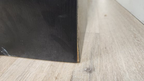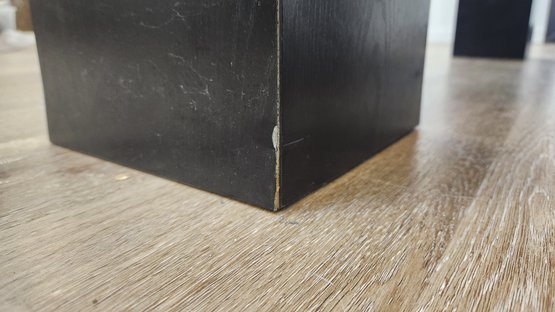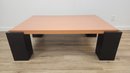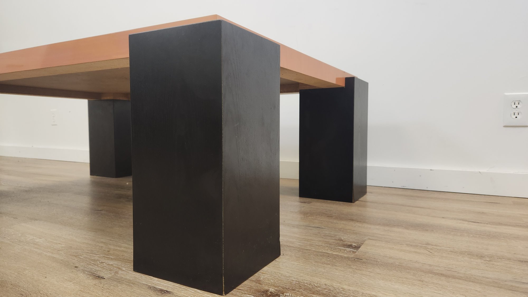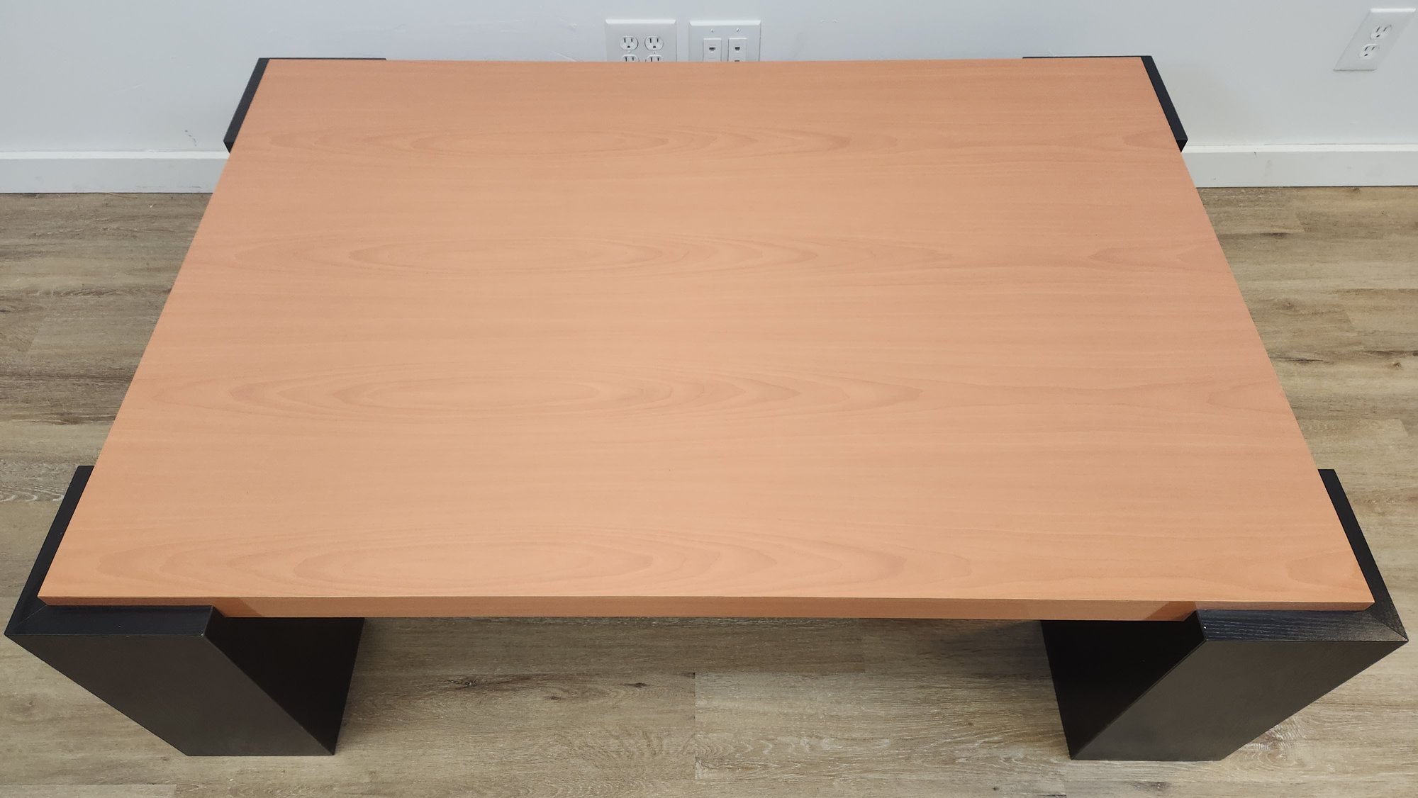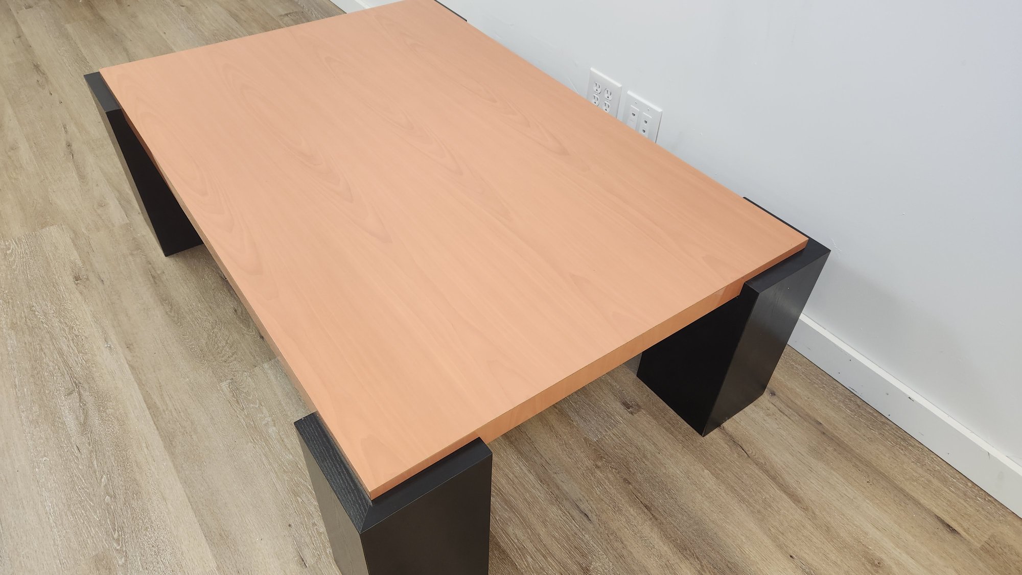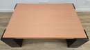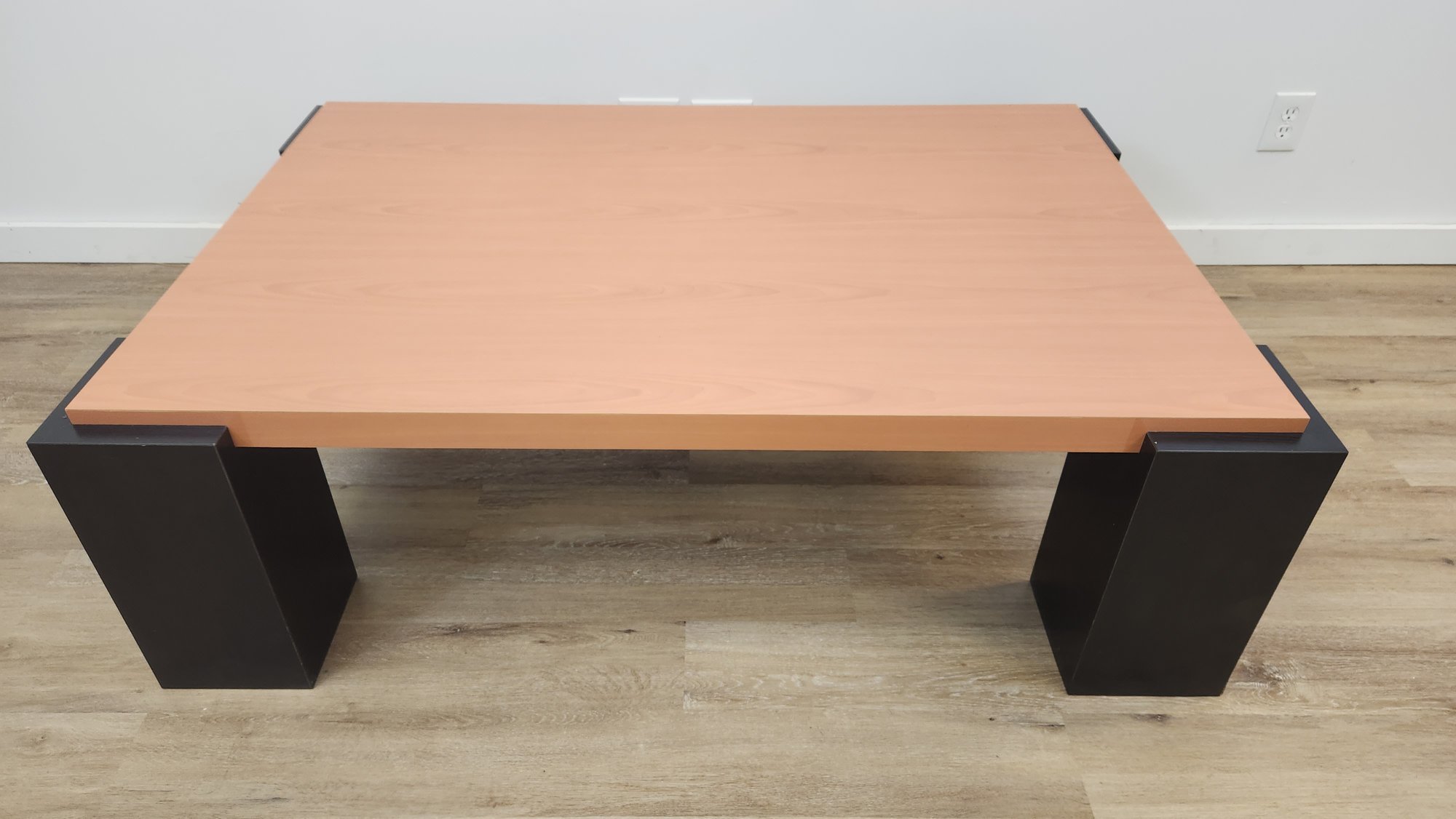 Wood coffee table with glossy finish with black block legs. Good condition.
