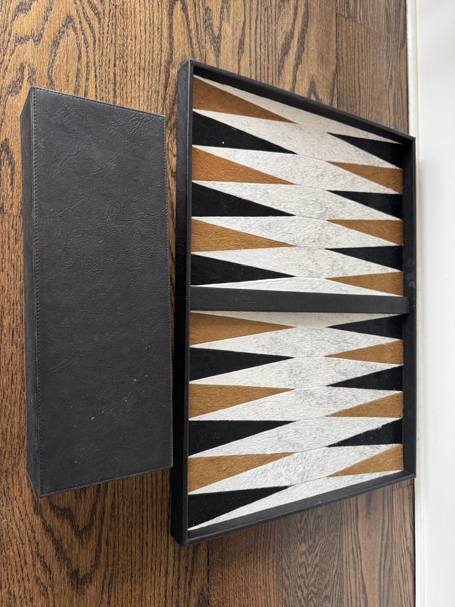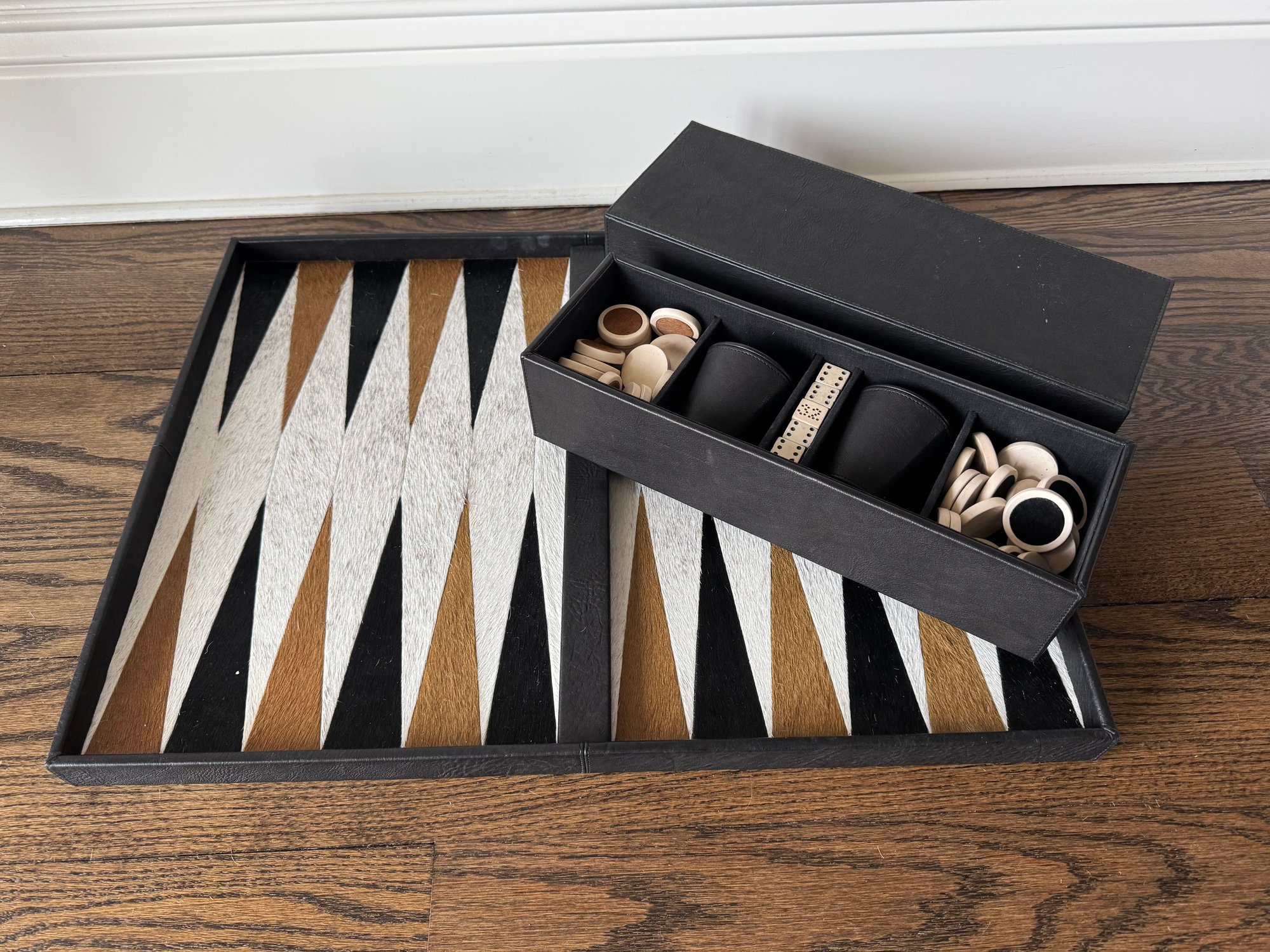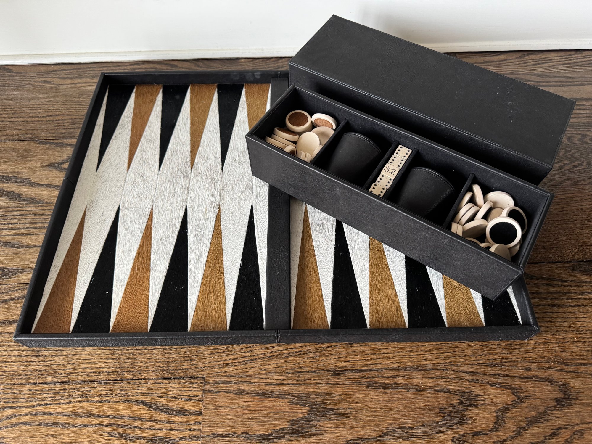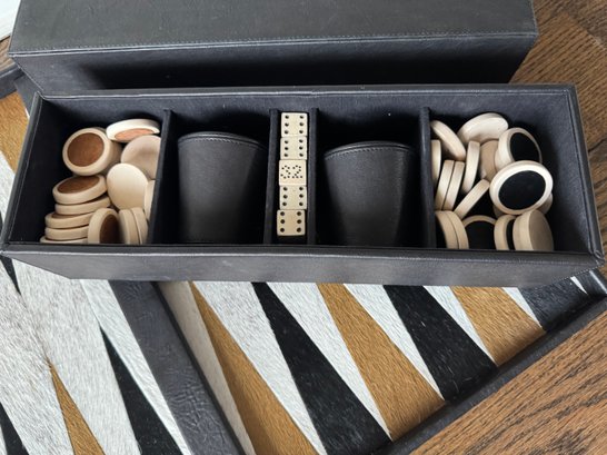 Backgammon Set of Black Lamb Leather and Multicolor Hides with Leather Storage Box and Cup, Earthenware and Hide Playing Pieces, and Earthenware Dice, Embossed with Gilles Caffier hallmark