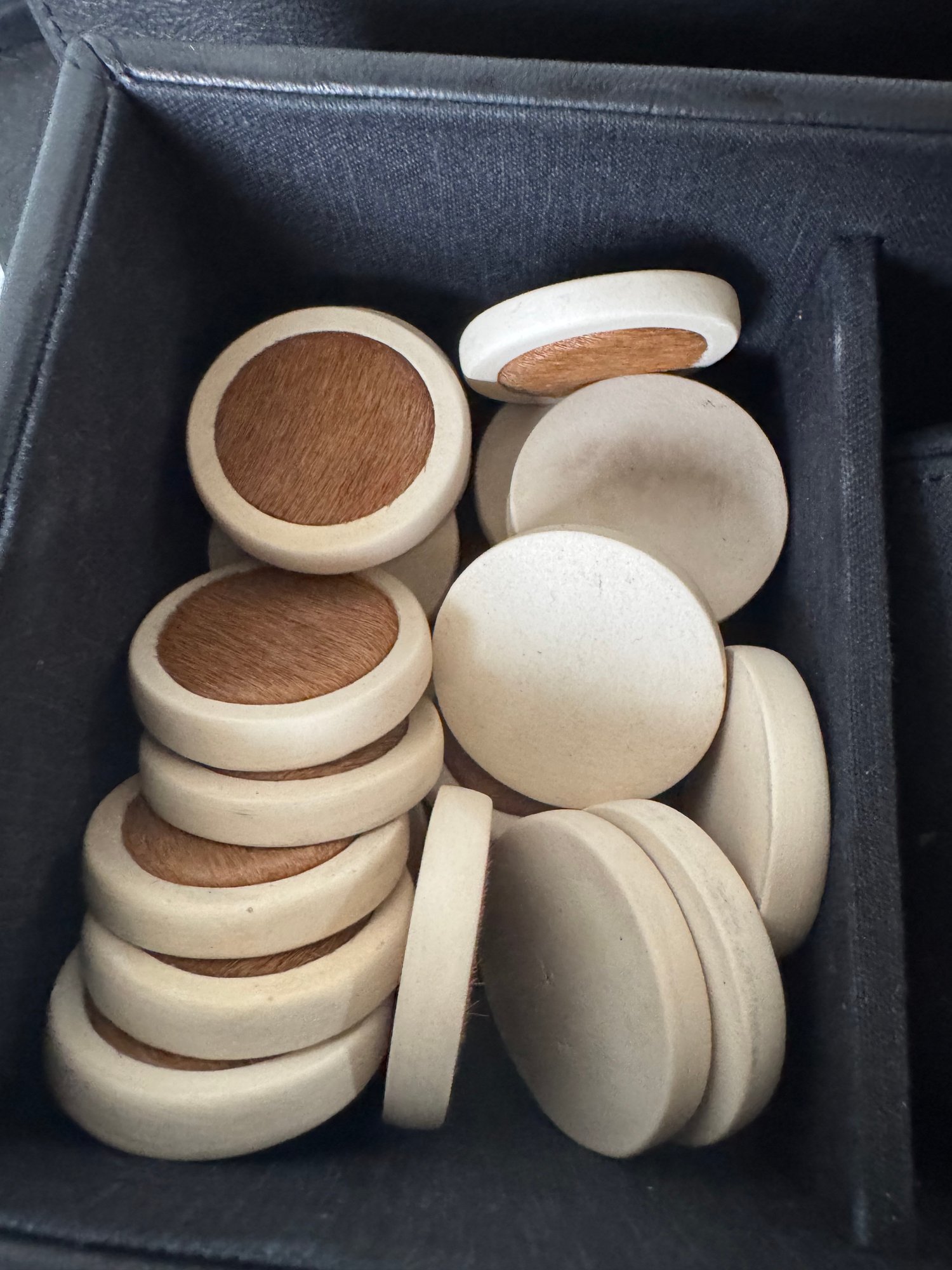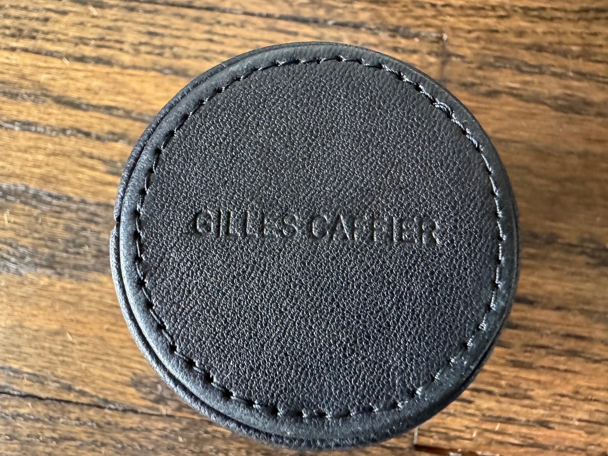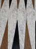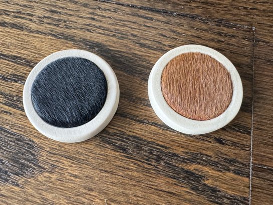 Backgammon Set of Black Lamb Leather and Multicolor Hides with Leather Storage Box and Cup, Earthenware and Hide Playing Pieces, and Earthenware Dice, Embossed with Gilles Caffier hallmark