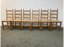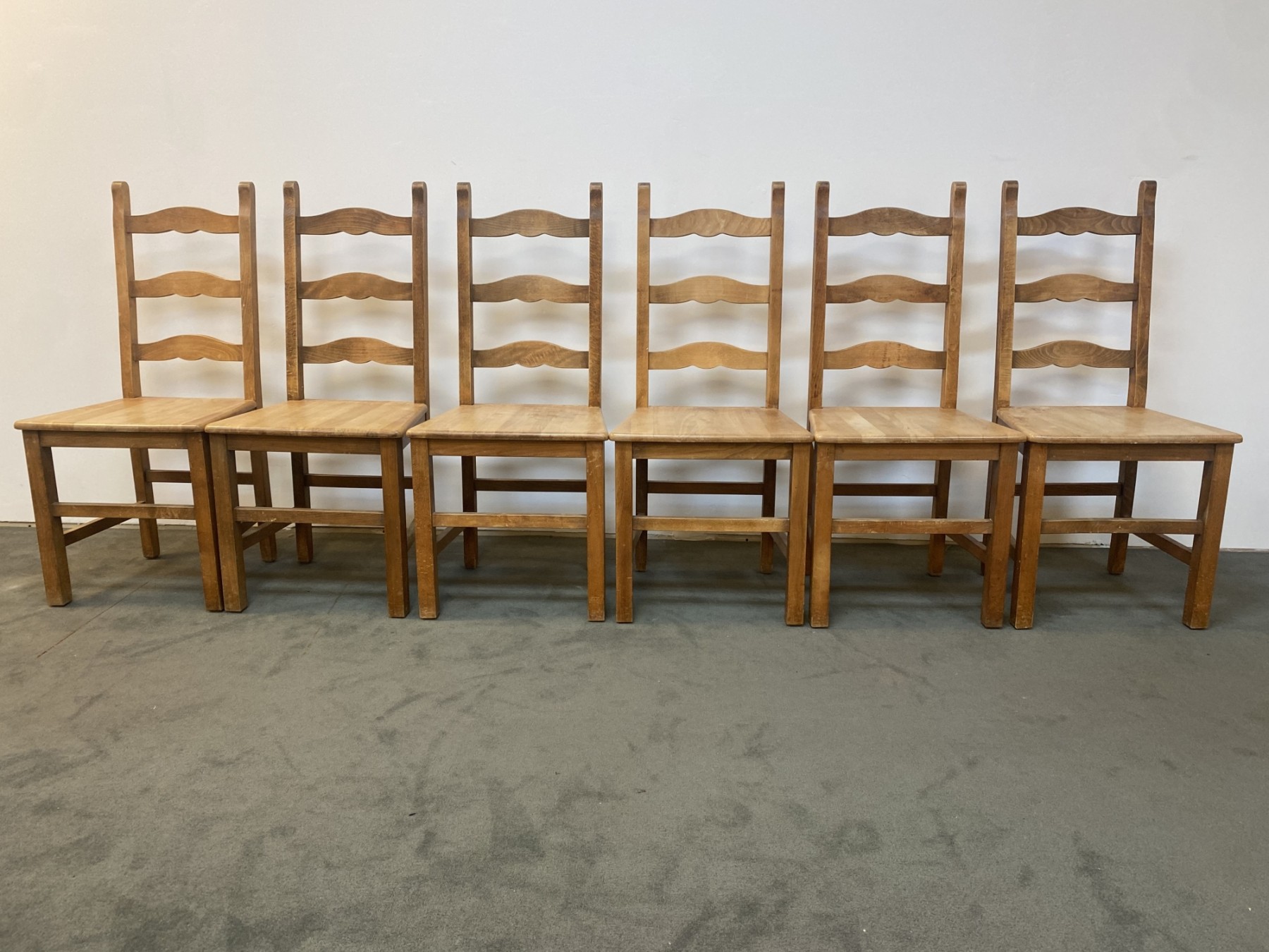 6 pine chairs in good condition. Shows normal wear for age. Great farmhouse style.
