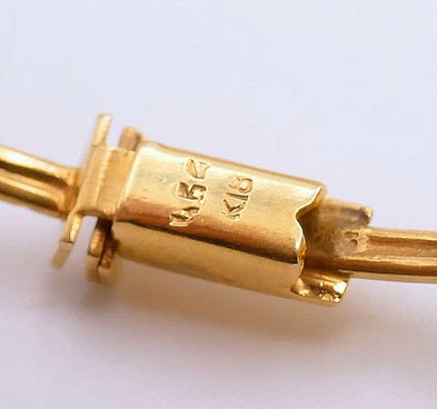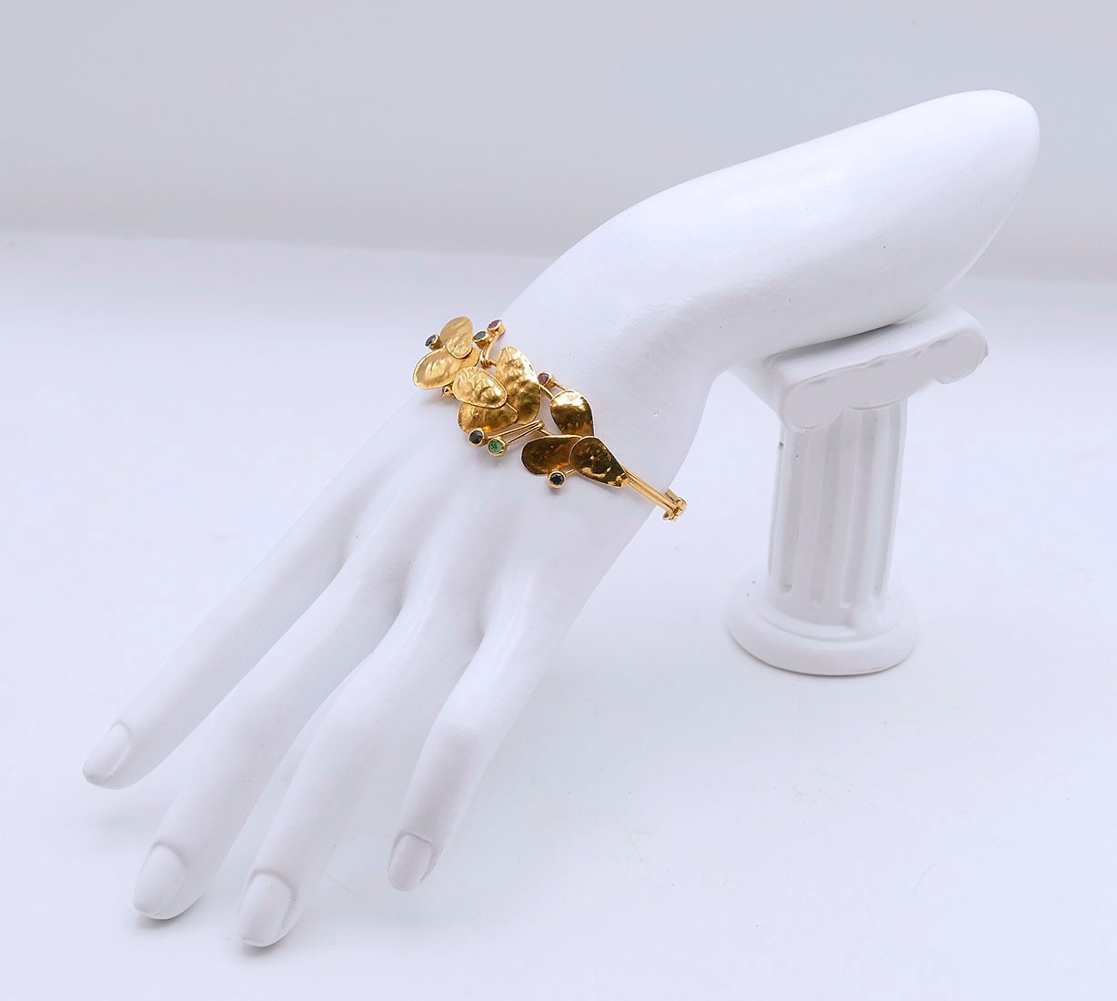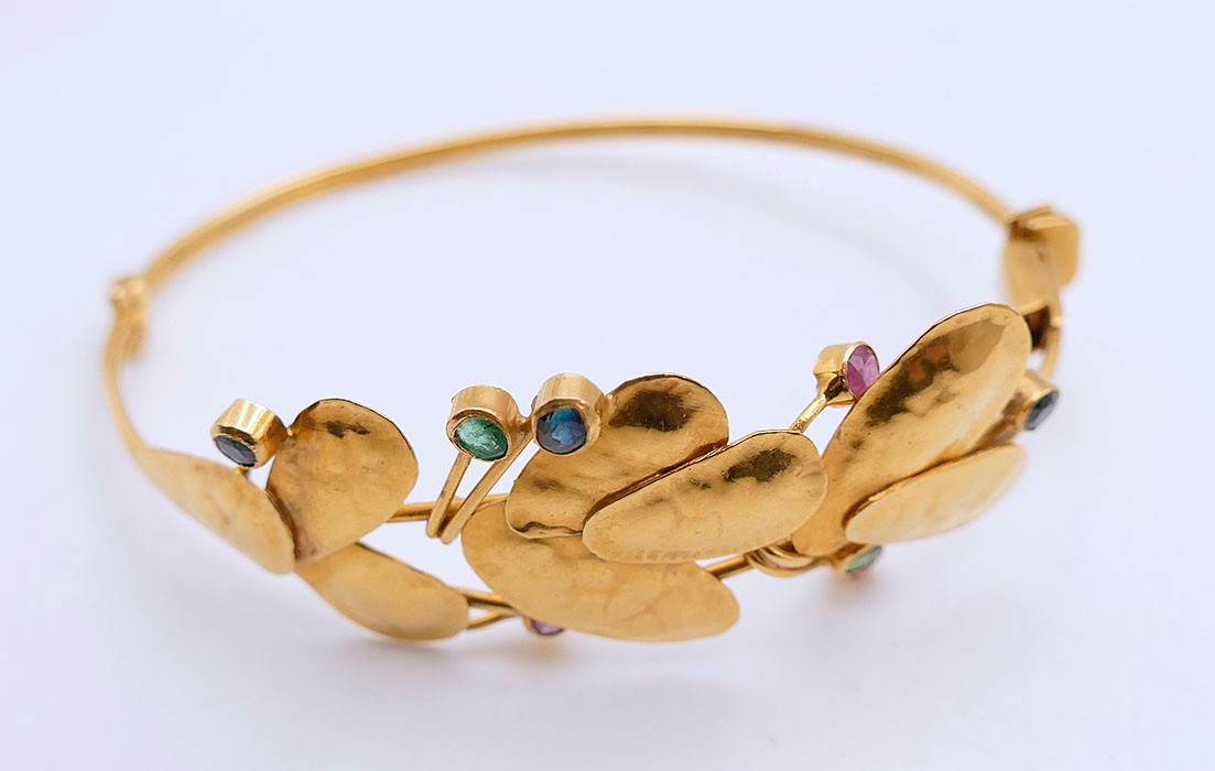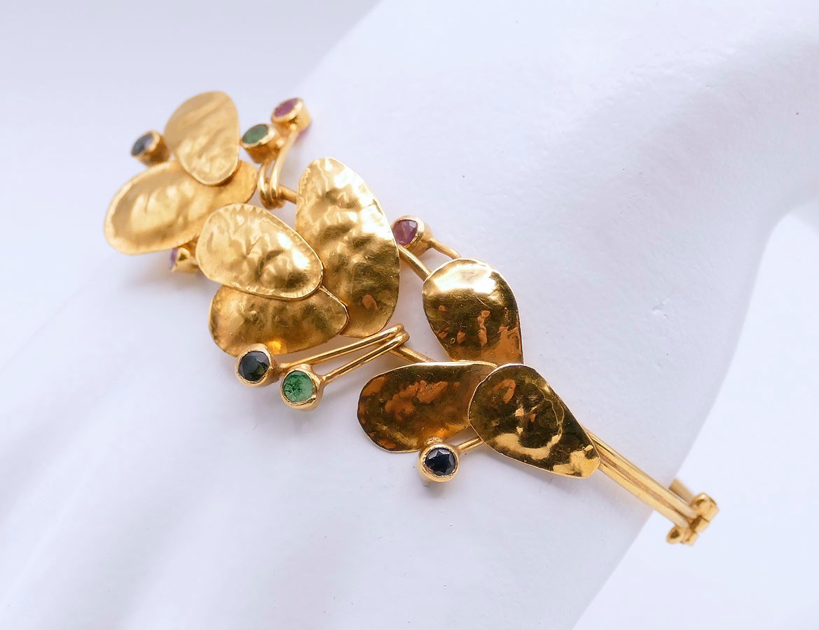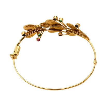 18K Yellow Gold Bangle Bracelet With Gemstones. In Very Good Condition. 2 1/2" x 2 1/4" opening, 7/8" wide. Total Weight: 13.62 Grams (.44 Troy Ounces).