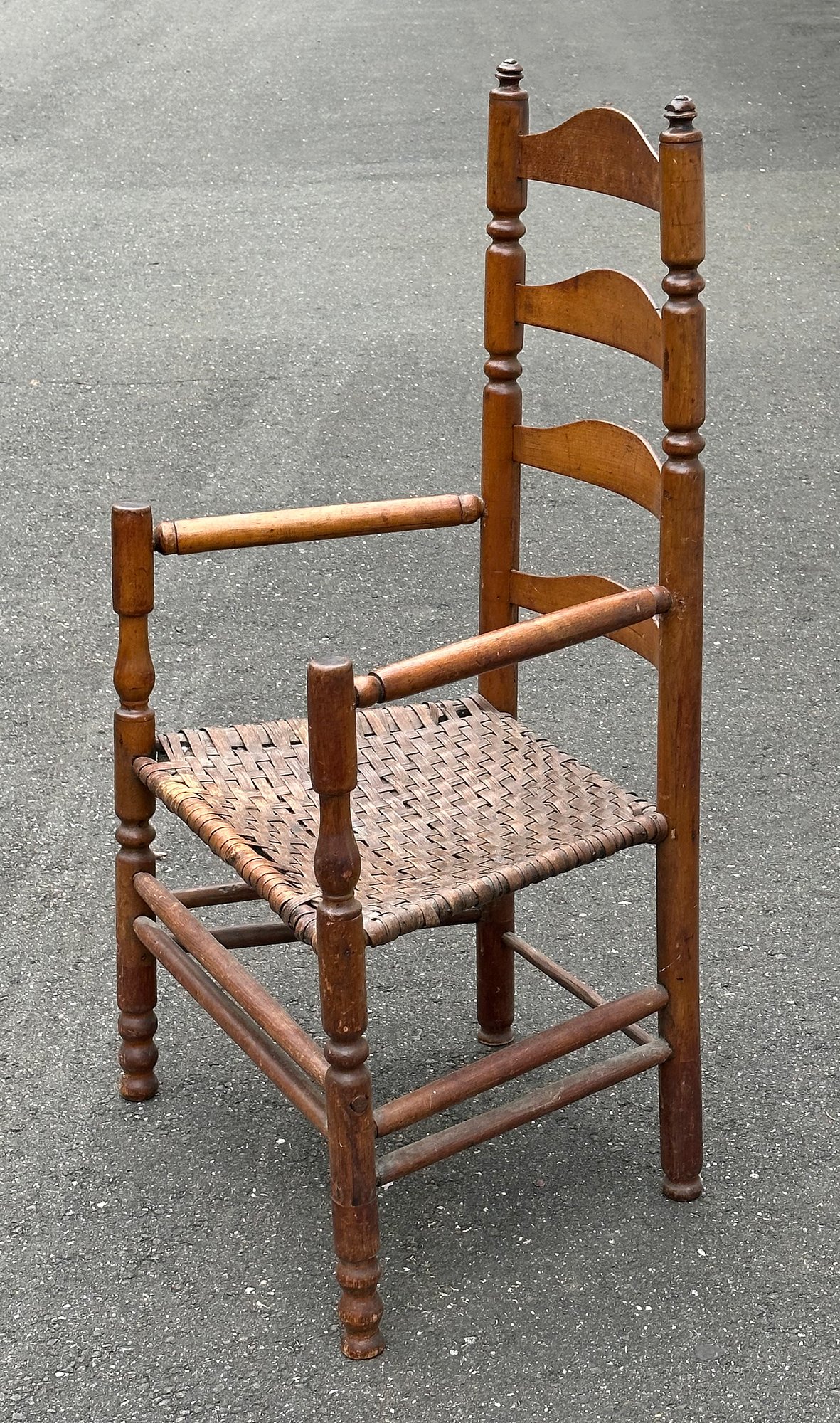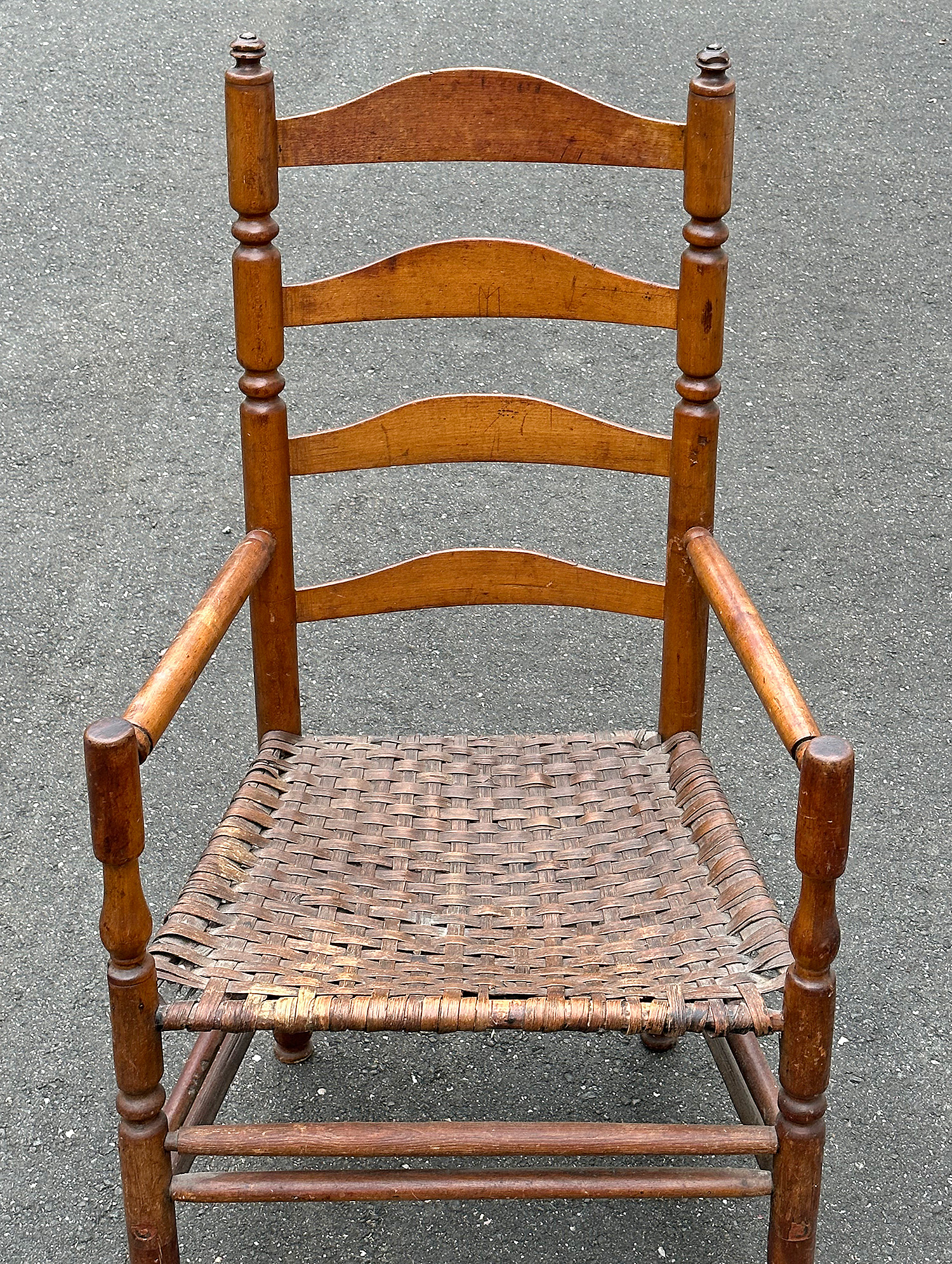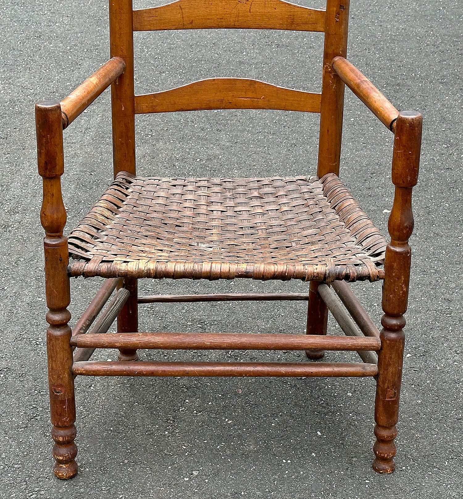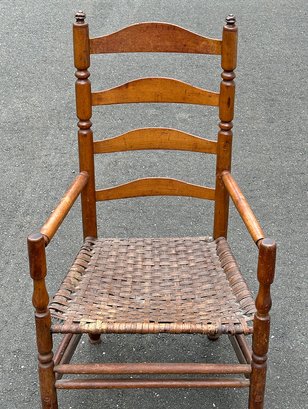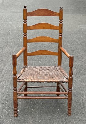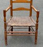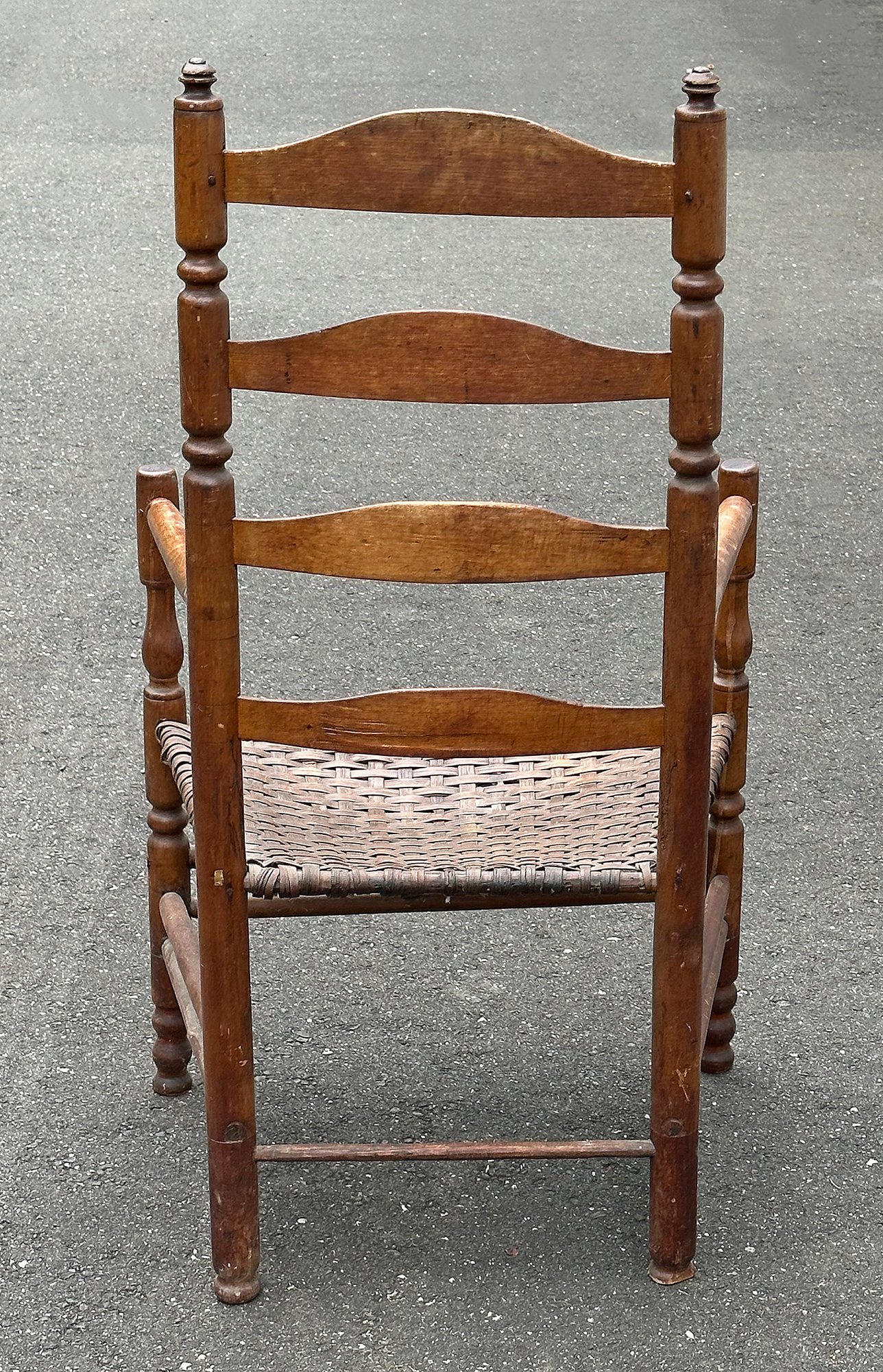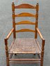 18th Century American Ladderback Armchair, With sausage turned stiles and front legs, four slats, splint seat, and a double box stretcher. In good condition. 17.5" x 22.5" x 42"h