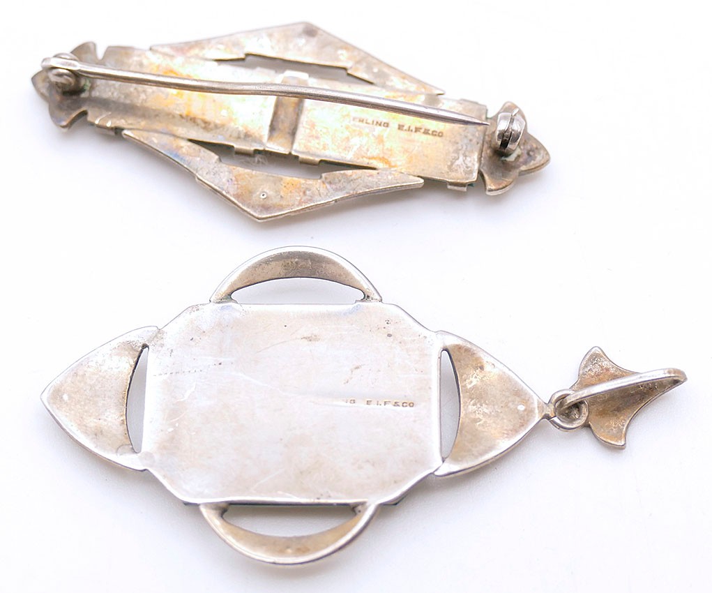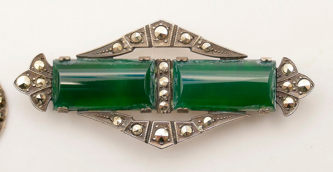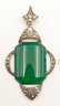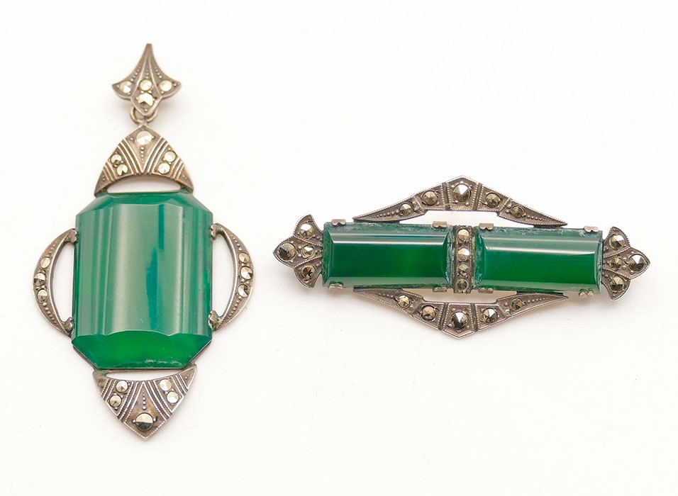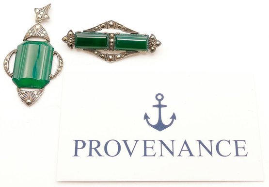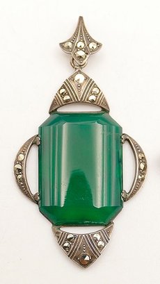 1930's Art Deco Sterling Silver With Chrysoprase And Marcasite Pendant & Brooch. Made By E.I.F & Co; stamped Sterling on the backs. Both are in Very Good Cosmetic Condition. The brooch might need repair or a better locking mechanism on back. Measurements: 2.25" x 1.25" (pendant) / 2" x .675" (brooch). Total Weight: 11.43 Grams (.37 Troy Ounces)