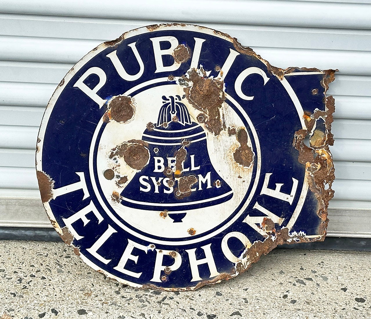 1930's Bell Telephone Porcelain Enamel Flanged Advertising Sign. In fair condition with a lot of wear, tear, and rusting. 21" x 18"