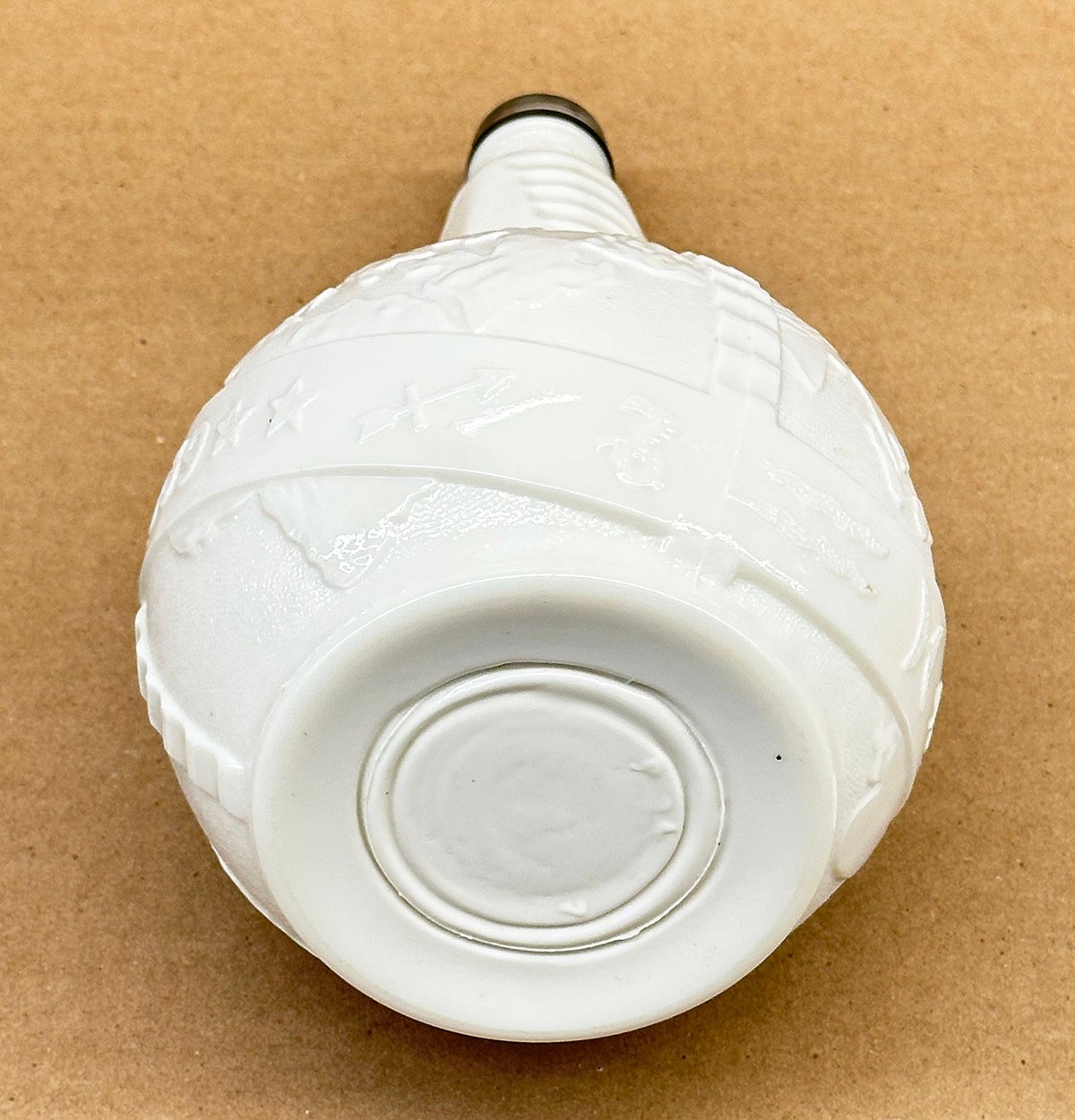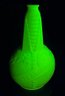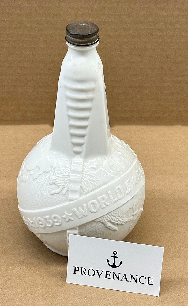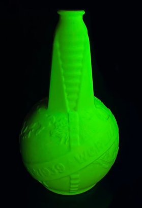 1939 New York World's Fair Uranium Milk Glass Bottle. Made by Anchor Hocking and originally held cider vinegar. In Good Condition. 8.5" Tall, 5" Diameter.
