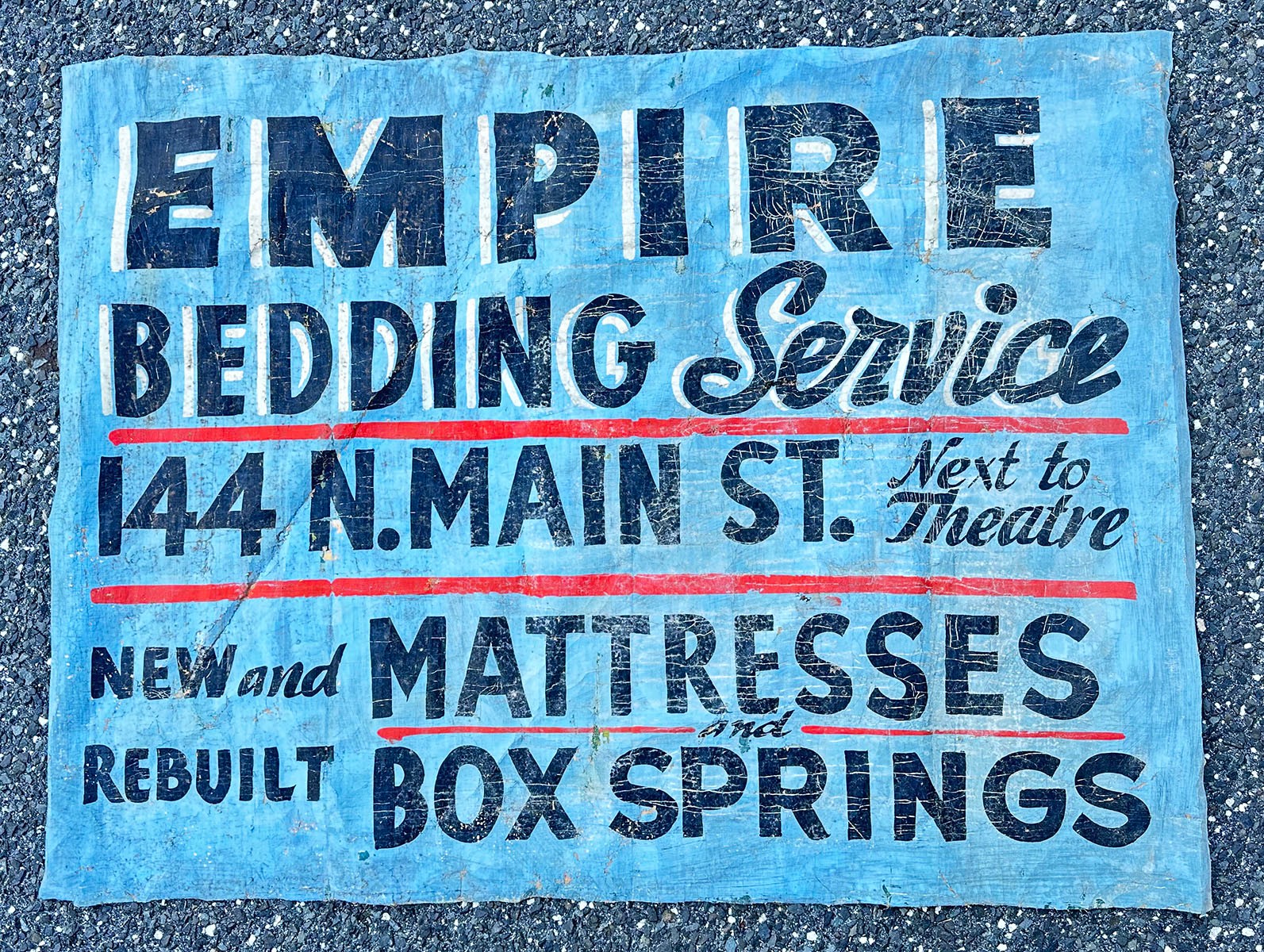 1940's Hand-Painted Canvas Sign From Waterbury CT - EMPIRE BEDDING SERVICE. We received a few 1930's-1940's hand painted signed from the Palace Theater, so we're guessing that this hung outside the theater. Some wear and tear. Piece of Waterbury, CT history. Canvas Size: 31" x 40"