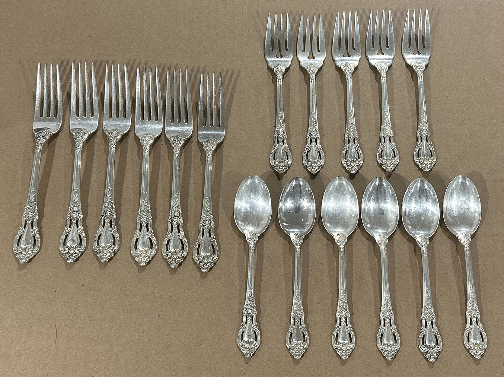 1950's Lunt Eloquence Sterling Silver Flatware - Dinner Forks, Side Forks, Dinner Spoons (17-PC). 92.5% Pure Silver. In very good condition and with no monograms. Includes 6 - 7.5" Dinner Forks, 5 - 6.5" Side Forks, and 6 Spoons . Total Weight - Approx 835 Grams (29.5 Ounces)