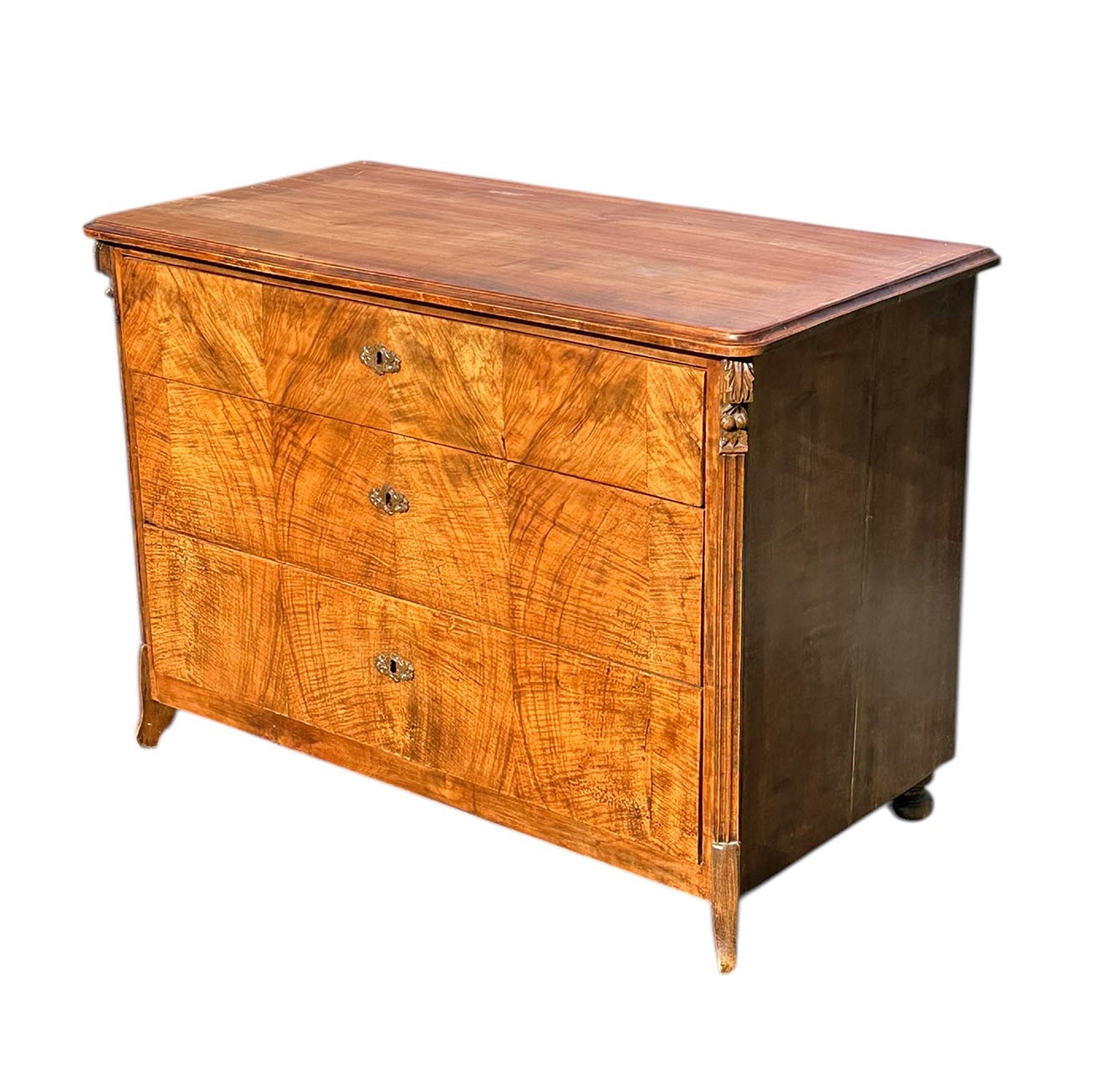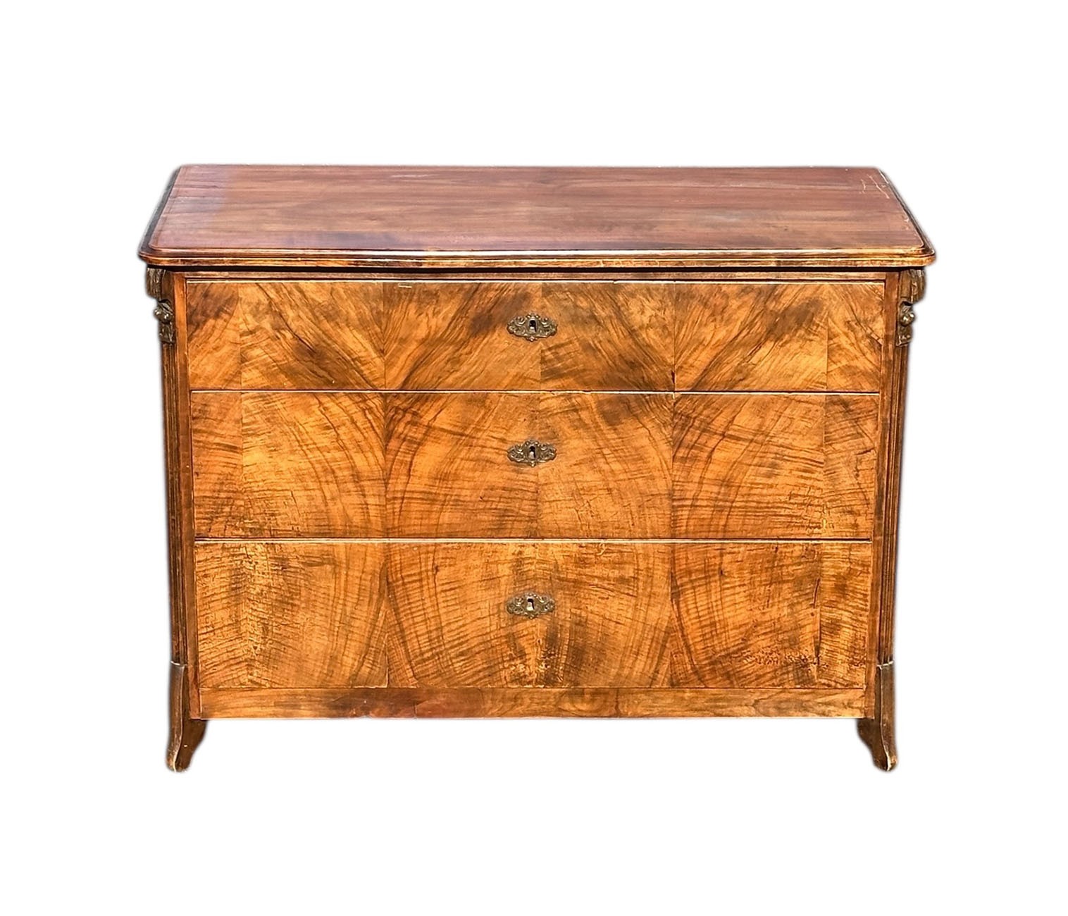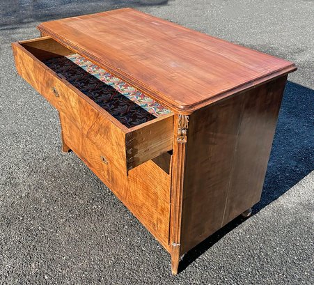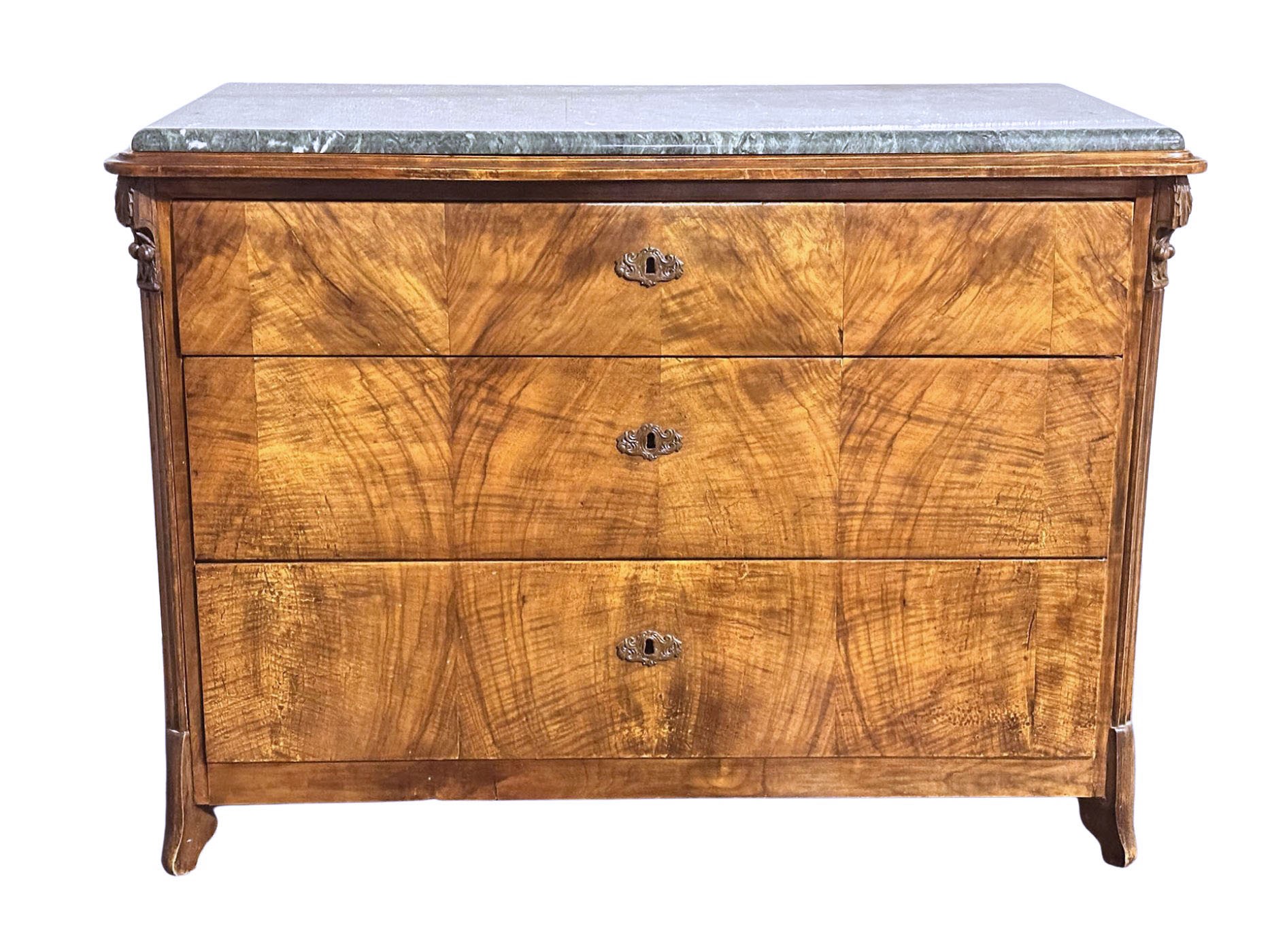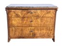19th C. Walnut Commode In The Manner Of Beidermeier. With marble top. In good condition with some overall wear. The marble top was purchased by the consignor but is not original to the dresser. The orignal wood top does have some wear and fading from the marble. Key not included. 45"w x 23"d x 33"h