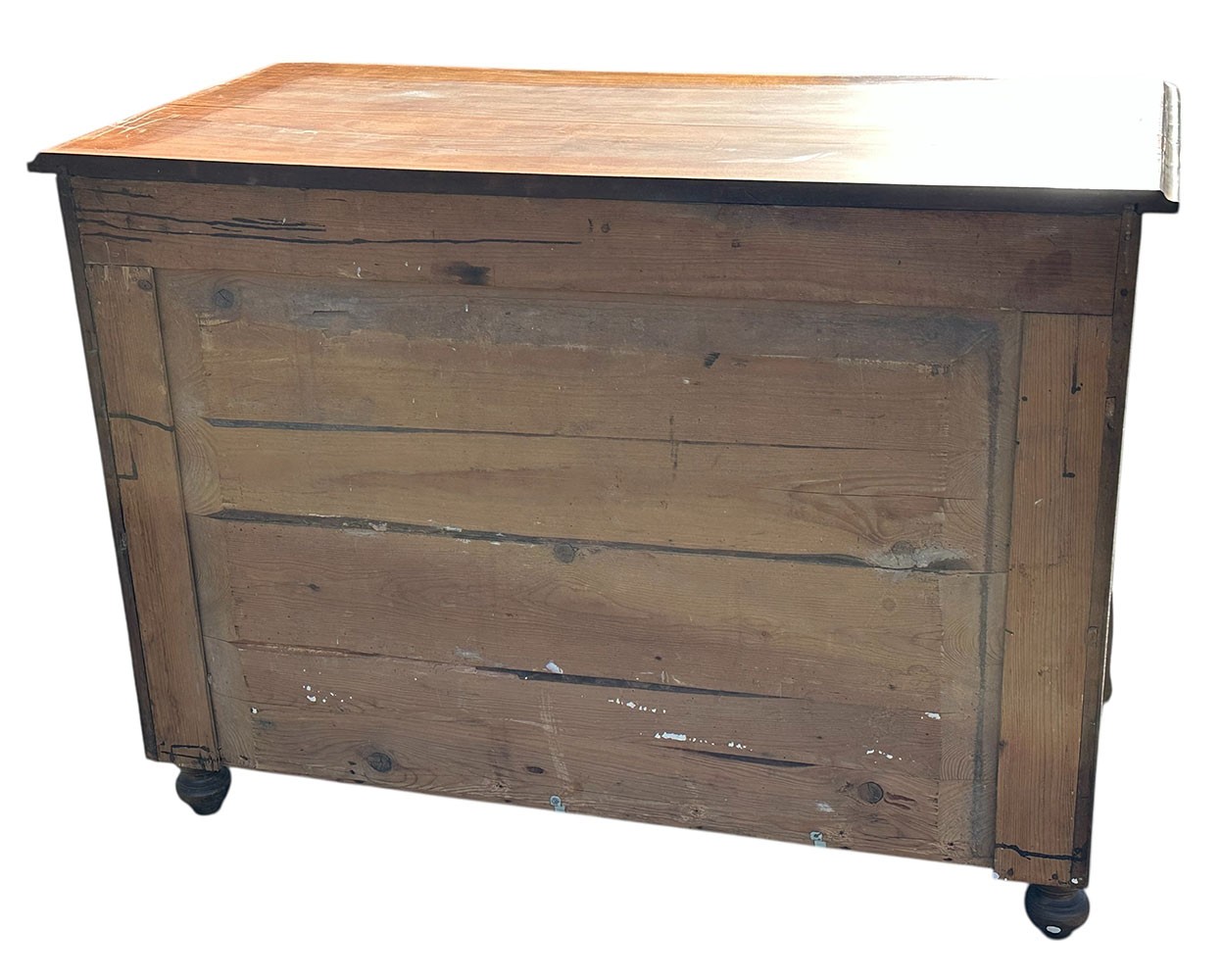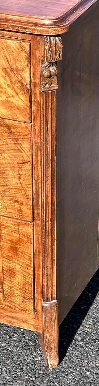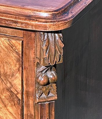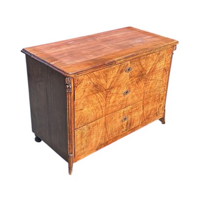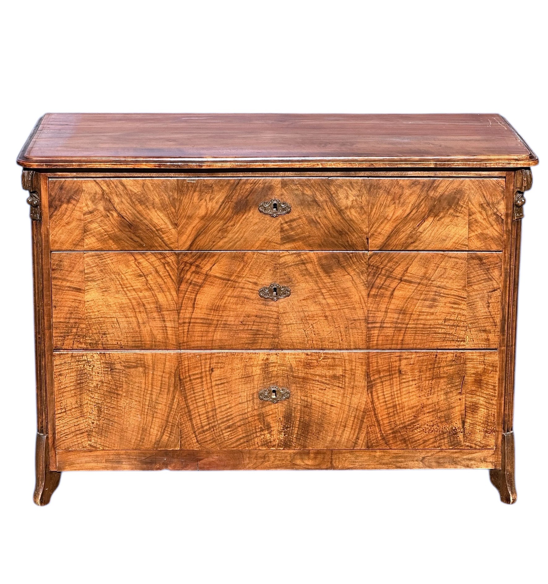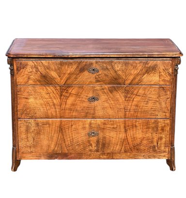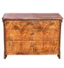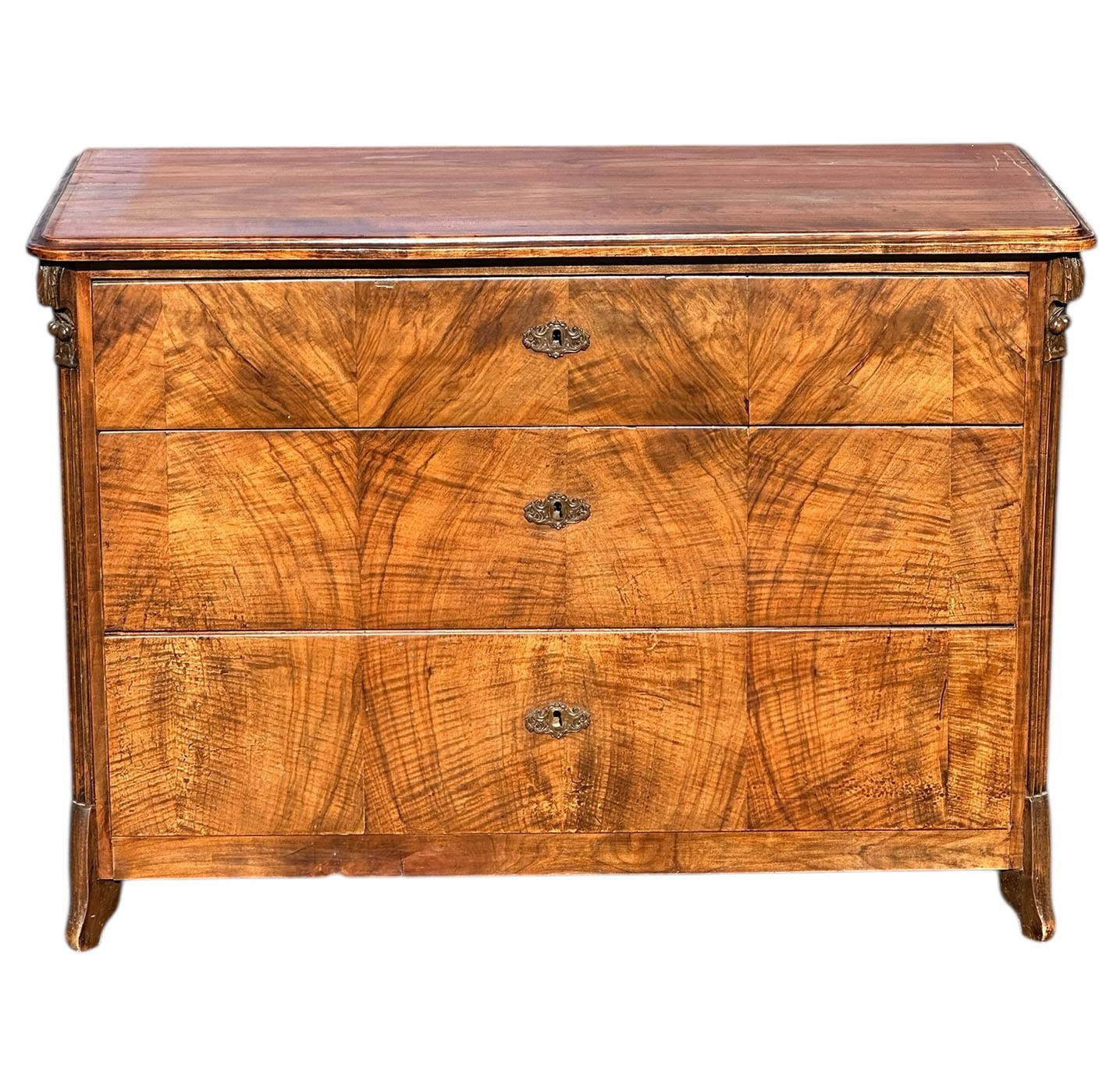 19th C. Walnut Commode In The Manner Of Beidermeier. With marble top. In good condition with some overall wear. The marble top was purchased by the consignor but is not original to the dresser. The orignal wood top does have some wear and fading from the marble. Key not included. 45"w x 23"d x 33"h