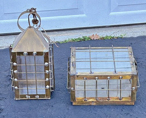 2 Vintage Brass Light Fixtures - Ceiling Mount & Pendant. The pendant light measures 8" x 8" x 16" and the ceiling mount measurements 12" x 12" x 7". The ceiling mount has not been wired and the pendant will need a electrician to install. Untested.