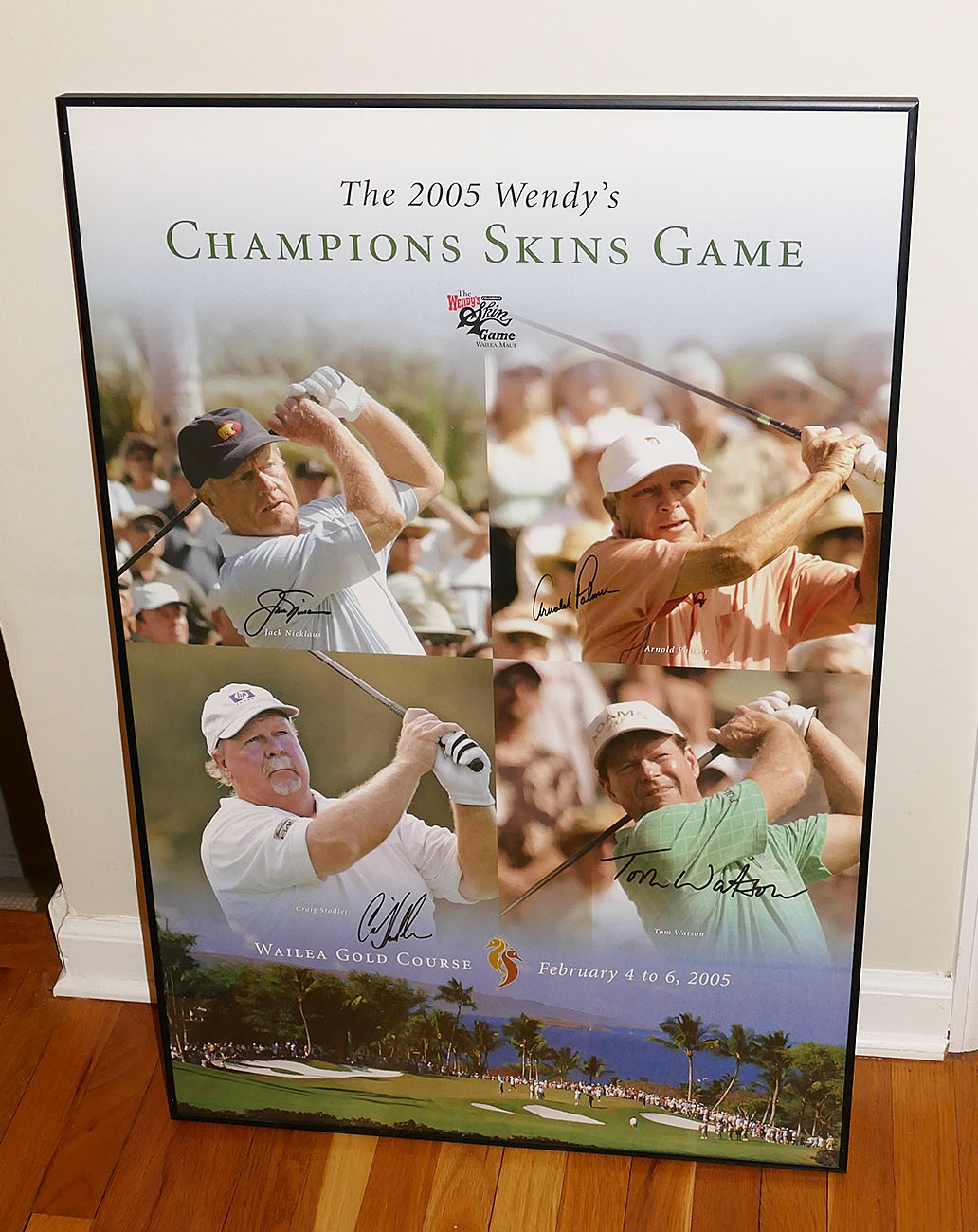 2005 Wendy's Champions Skins Game Golf Poster . This poster is hand signed in black marker by Jack Nicklaus, Arnold Palmer, Tom Watson, And Craig Stadler. Framed.