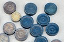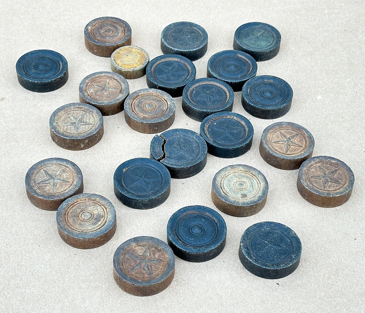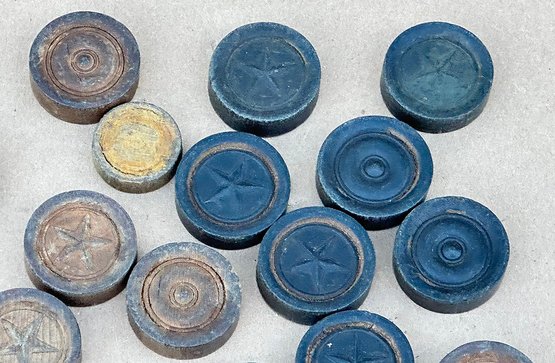 22 Antique Wooden Checkers. Some wear and tear; one checker has a broken edge.