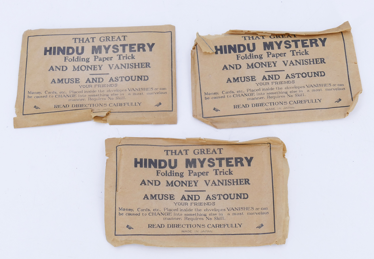 Never Opened / Sealed in the original envelope. 3 Rare Vintage Magic Illusions / Tricks from the 1930s - "That Great Hindu Mystery Folding Paper Trick". Although the tricks are still in their packages and have never been used or opened we cannot verify the condition.