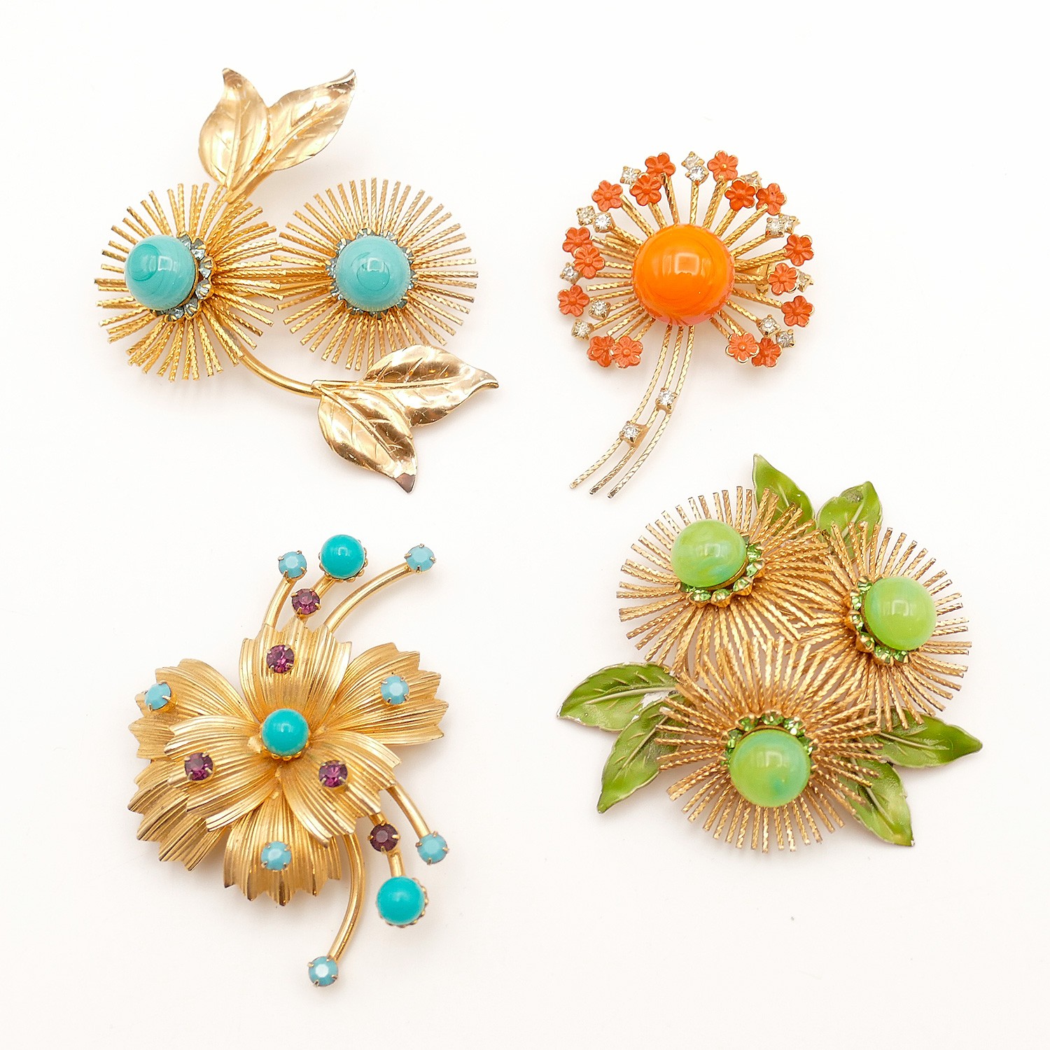 4 Vintage Joseph Warner Large Floral Rhinestone & Enamel Brooches. All pieces are marked on the backs "WARNER" or "Warner New York". In very good condition with no missing stones. Rare and hard-to-find Warner jewelry from a single collector!