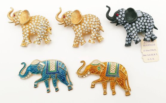 5 Vintage Joseph Warner Rhinestone & Enamel Elephant Brooches. All pieces are marked on the backs "WARNER". In very good condition with no missing stones. One of the brooches has the original tag. Rare and hard-to-find Warner jewelry from a single collector!