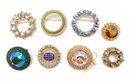 8 Vintage Joseph Warner Rhinestone Wreath & Round Brooches - Nixon Lodge. All brooches are marked on the backs "WARNER" or "JOSEPH WARNER". One of the brooches has the original tag. In very good condition with no missing stones. Rare and hard-to-find Warner jewelry from a single collector!
