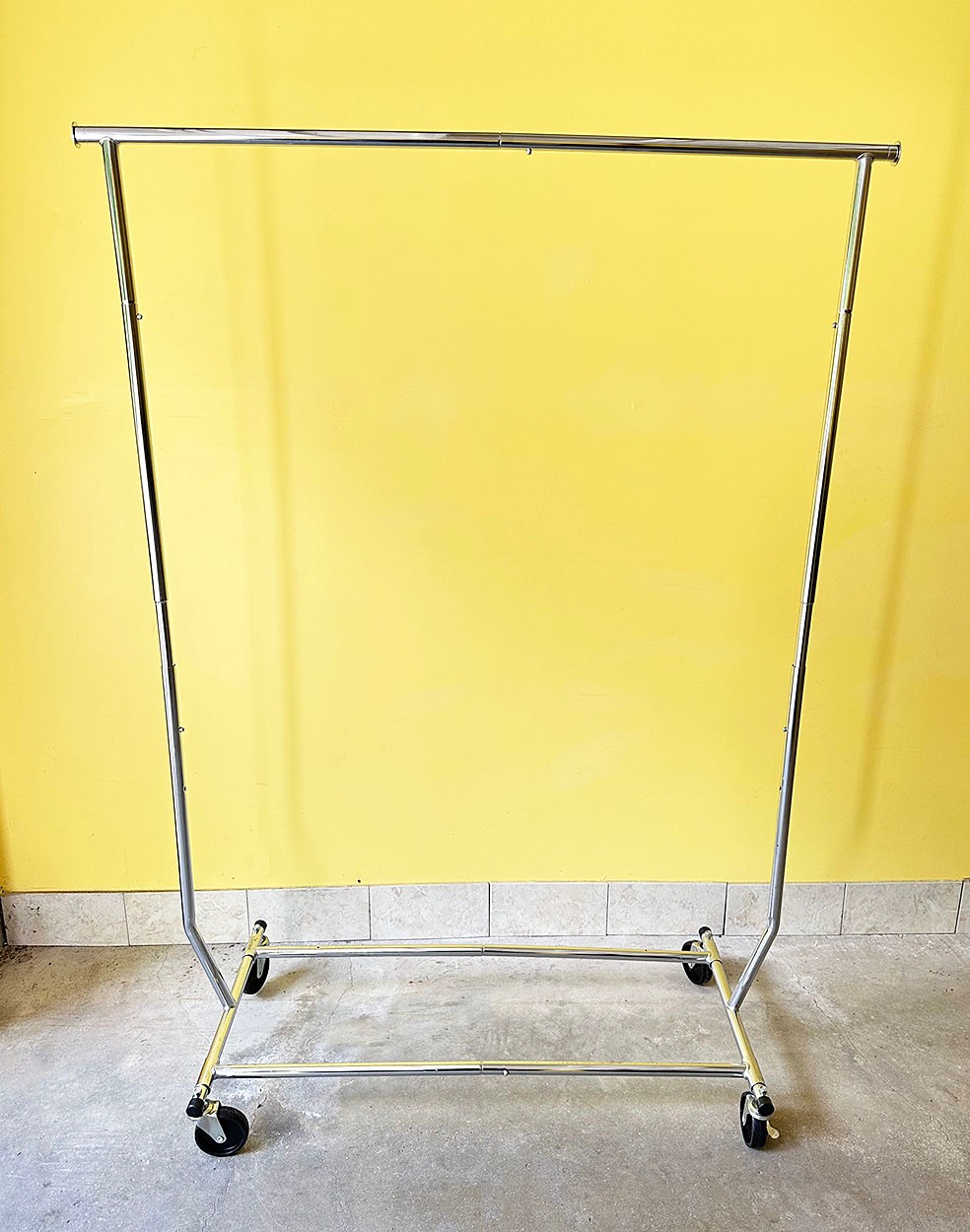 Adjustable Rolling Clothes Rack. In Very Good Condition.