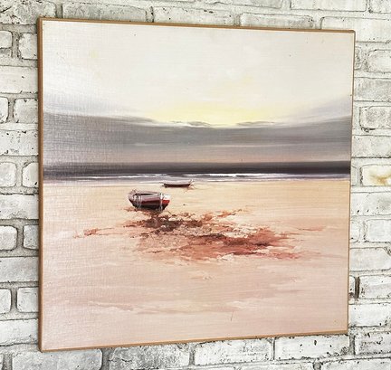 Painting on Board - Boat / Beach Scene. Artist Unknown. In good condition. 29" x 30"