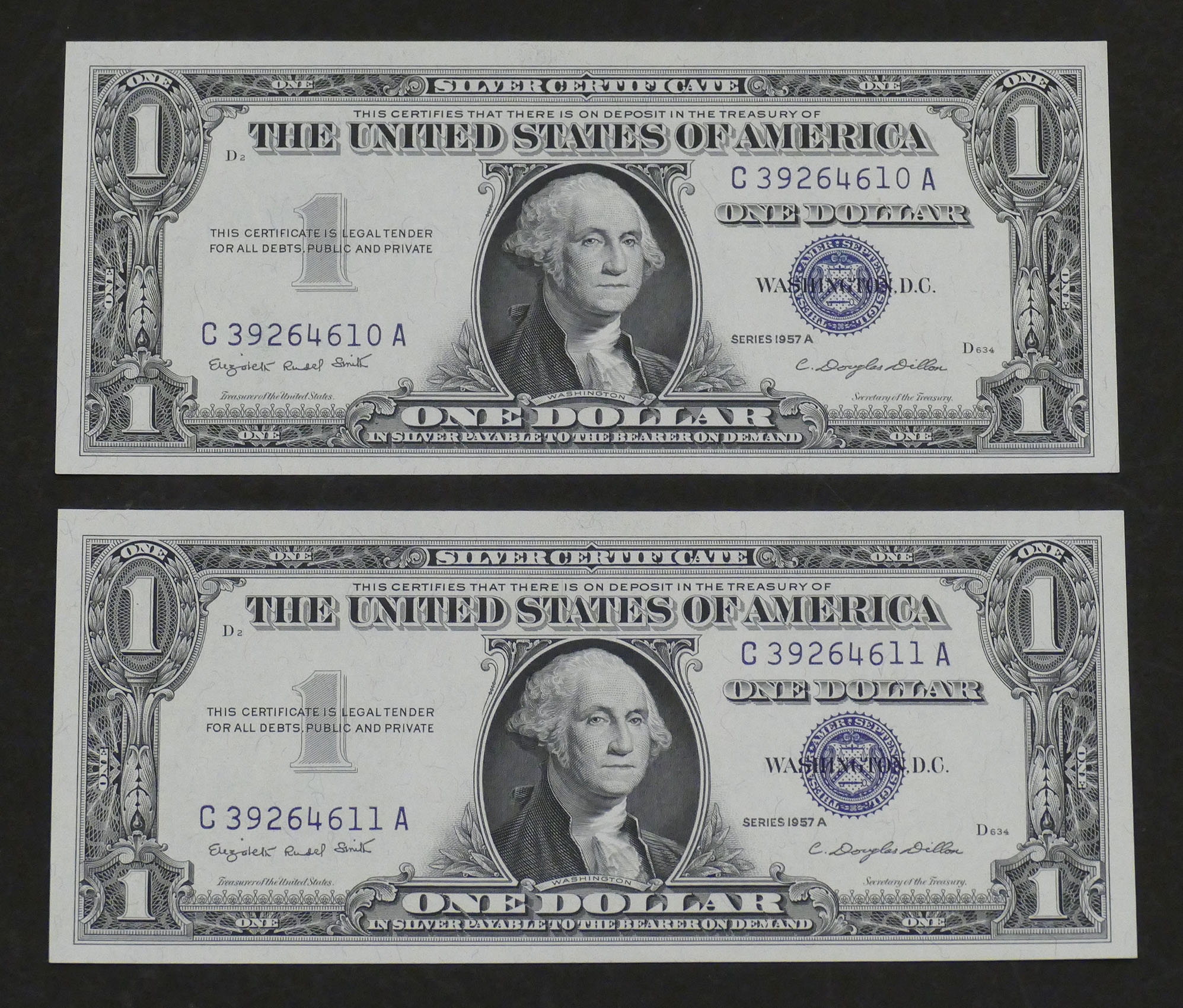 Pair Of 1957A $1 Bill Silver Certificates. With Consecutive Serial Numbers. In Crisp Uncirculated Condition.