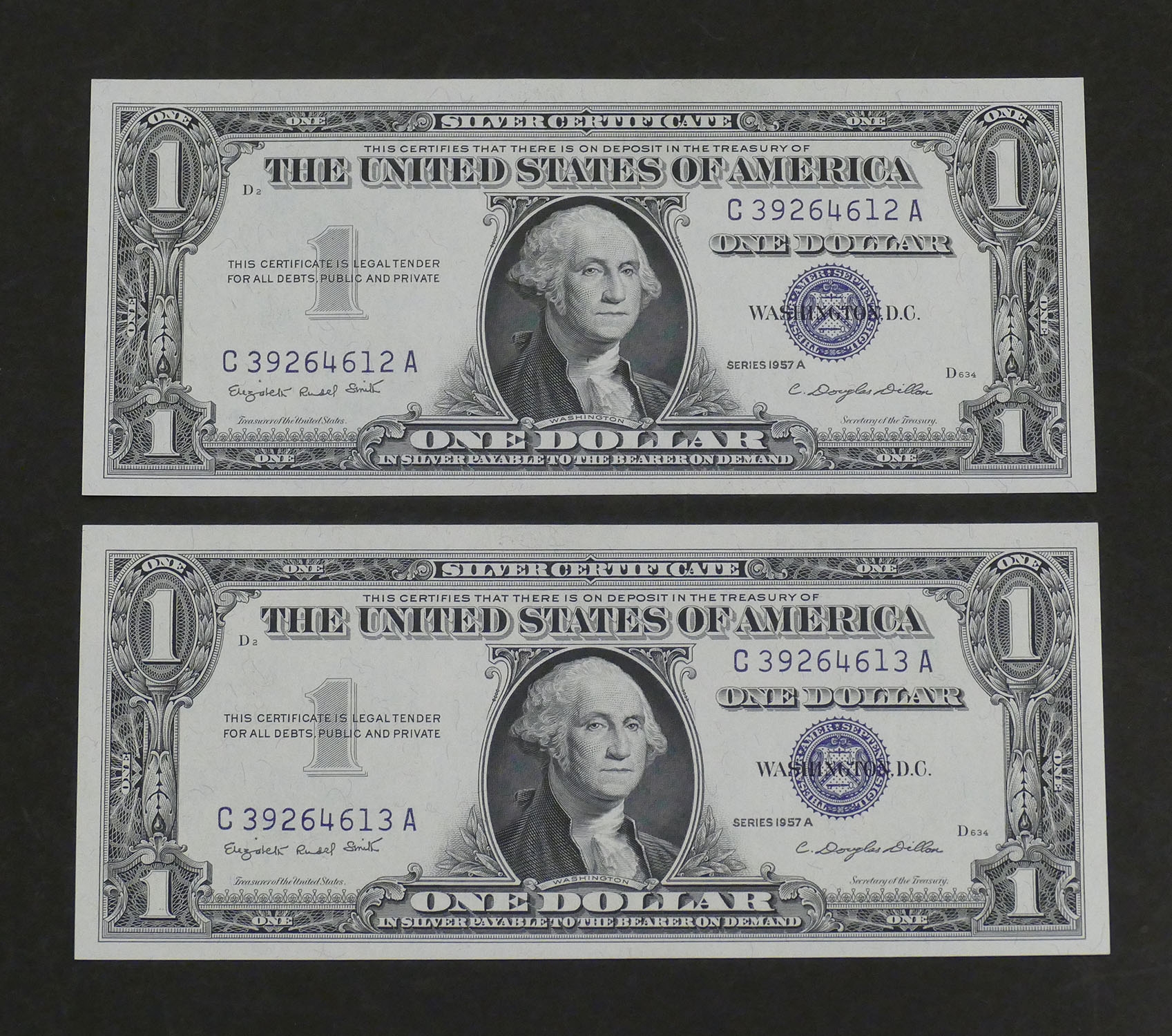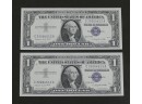 Pair Of 1957A $1 Bill Silver Certificates. With Consecutive Serial Numbers. In Crisp Uncirculated Condition.