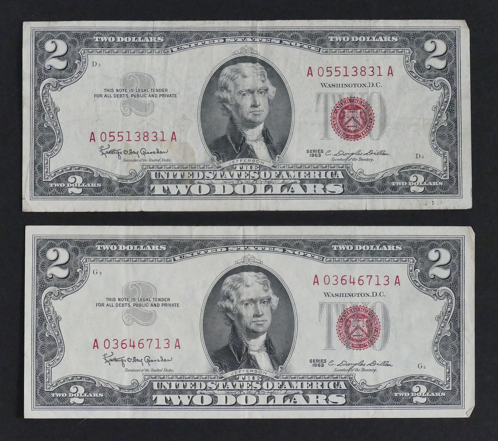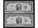 Pair Of 1963 $2 US Legal Tender Notes. In Good Condition. Comes in a plastic bill holder.