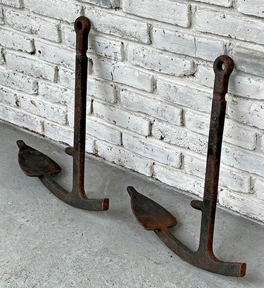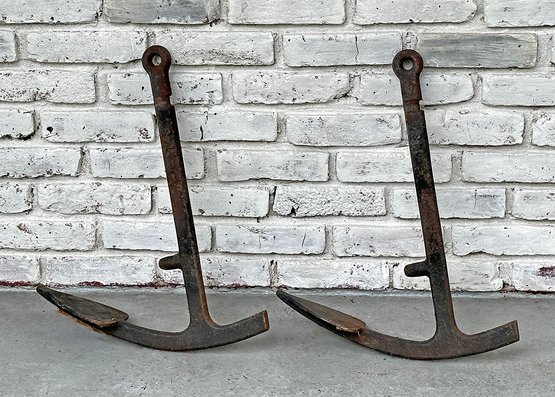 Pair Of Antique Cast Iron Anchors. Each one has part of the arm that was cut. Nice decor pieces. 17" x 22" (each).
