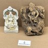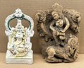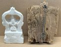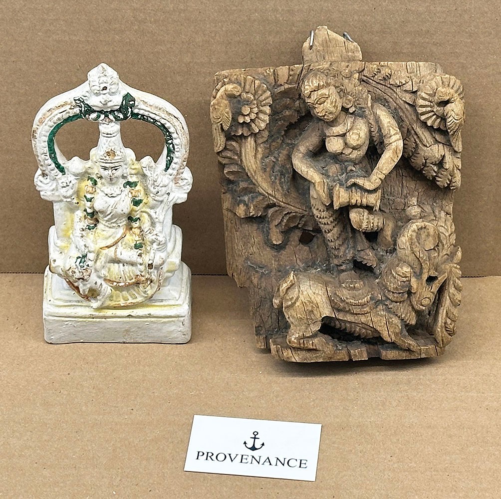 Pair Of Antique Indian Diety Sculptures. Includes a 19th C. wooden carved diety and a unknown painted clay white murti. Both are in good condition with some wear and aging.