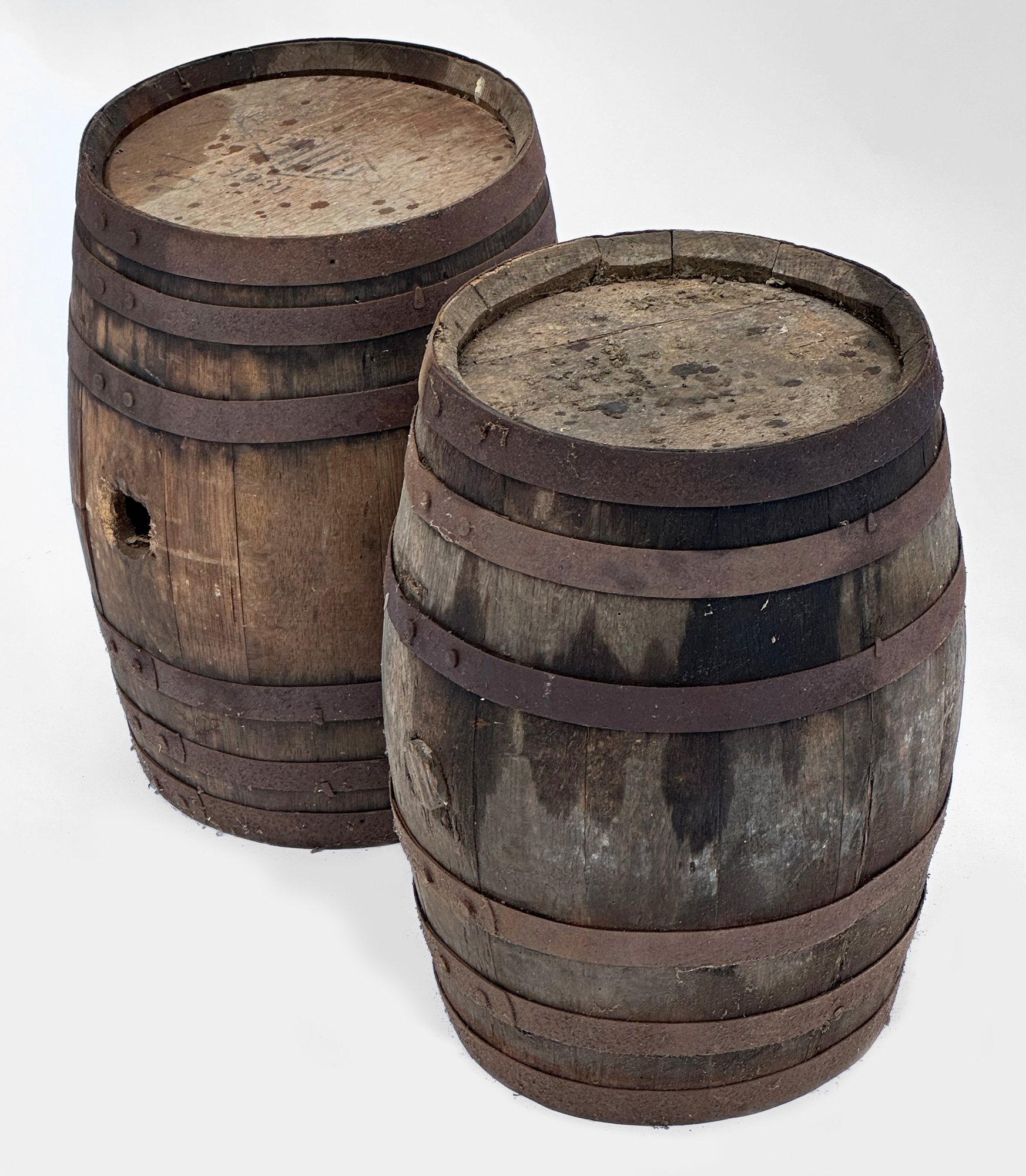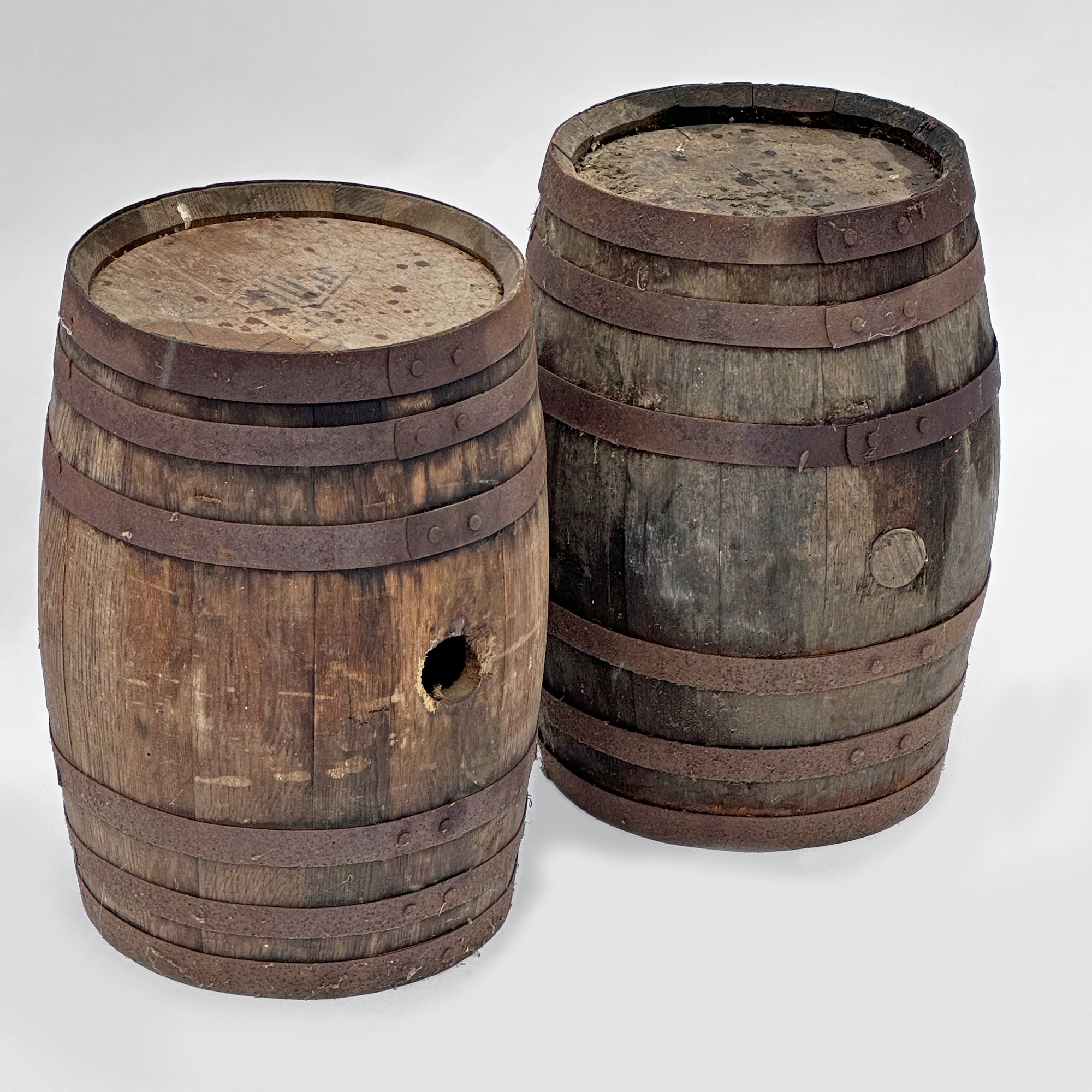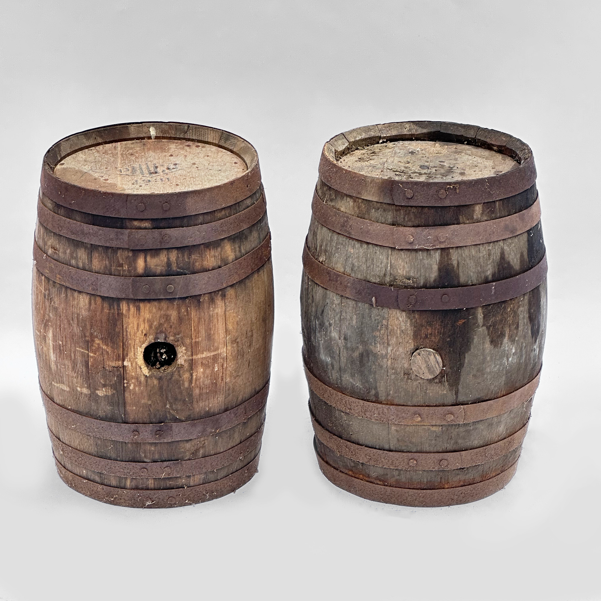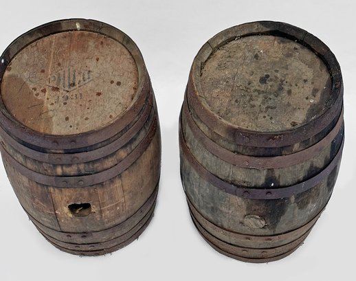 Pair Of Antique Oak Whiskey Barrels. One is stamped with the make and dated 1931. These have been in a barn and have some darkening and rusting on the steel bands. Nice display items. Each barrel measures 12" in diameter and 17" tall.