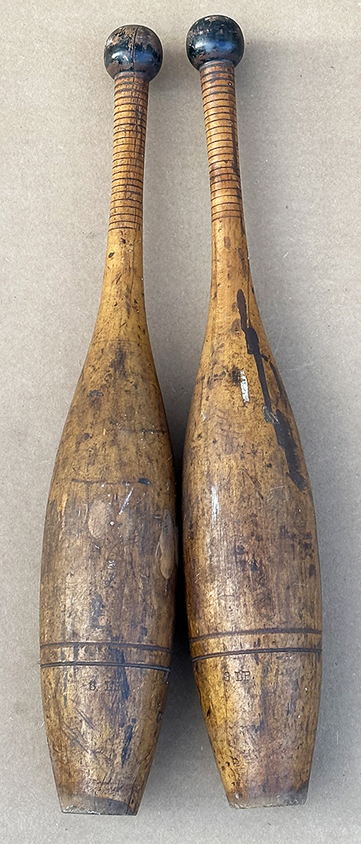 Pair Of Antique Wooden Juggling Pins. Each is marked "3 LB". In good condition; nice display pieces.