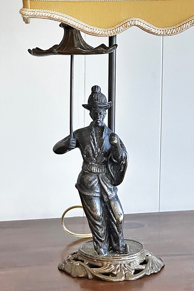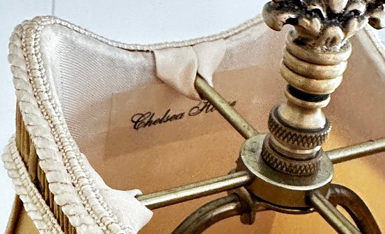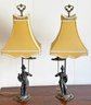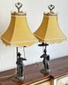 Pair Of Chelsea House Chinoiserie Style Patinated Metal Table Lamps. In Very Good Condition. 27" Tall, 10" Square Shades.