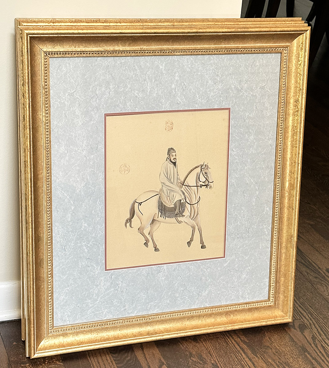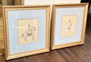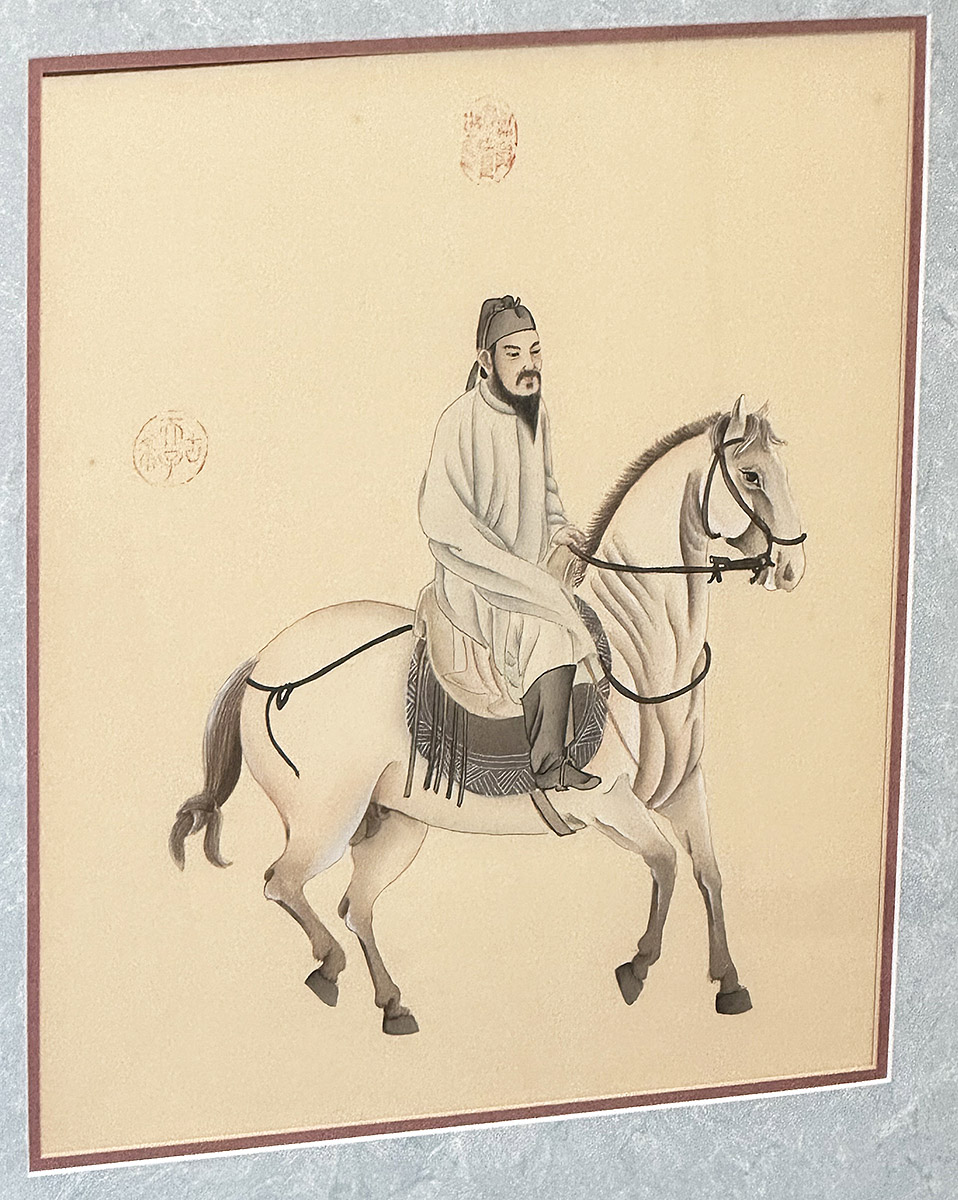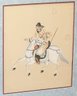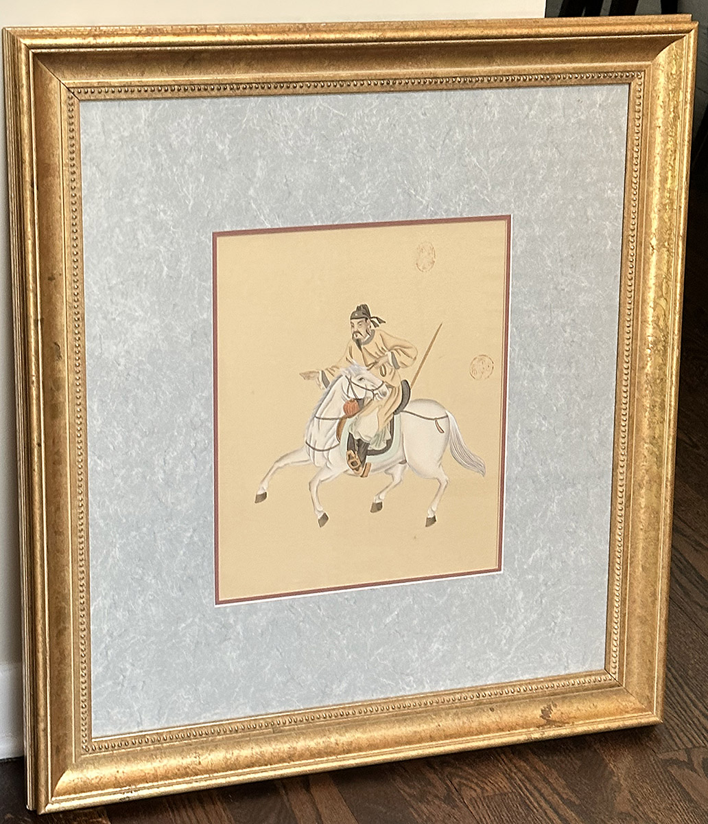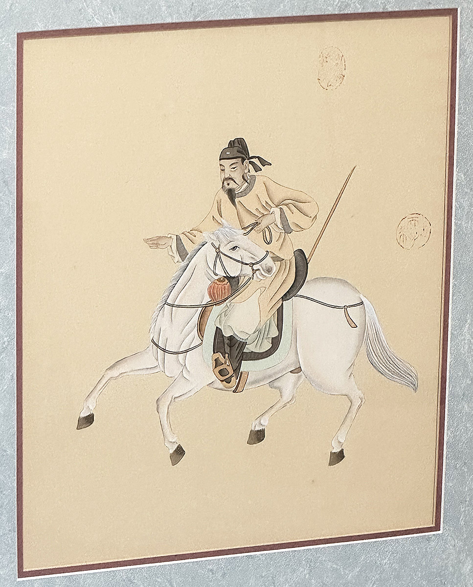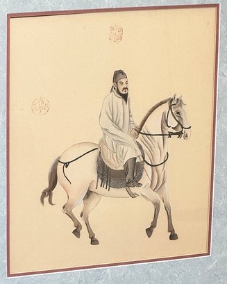 Pair Of Chinese Silk Paintings - Man And Warrior On Horseback. Nicely framed and in Good Condition. 26.25" x 28.75" (framed).