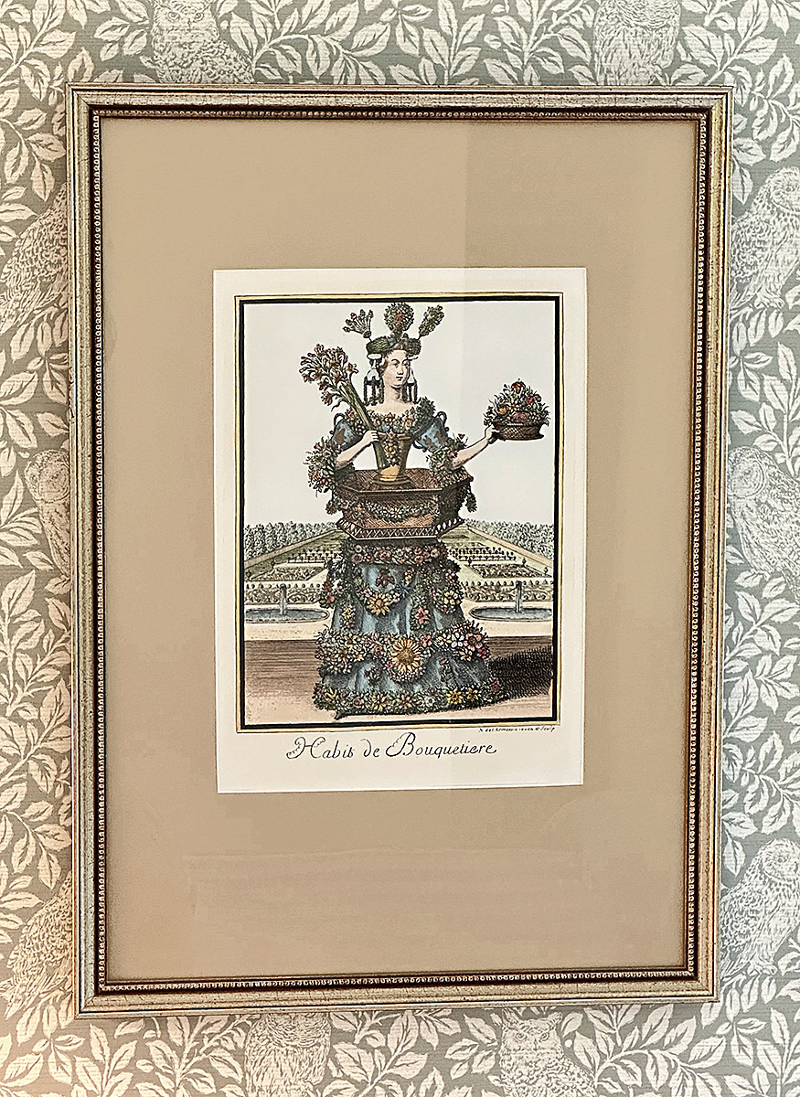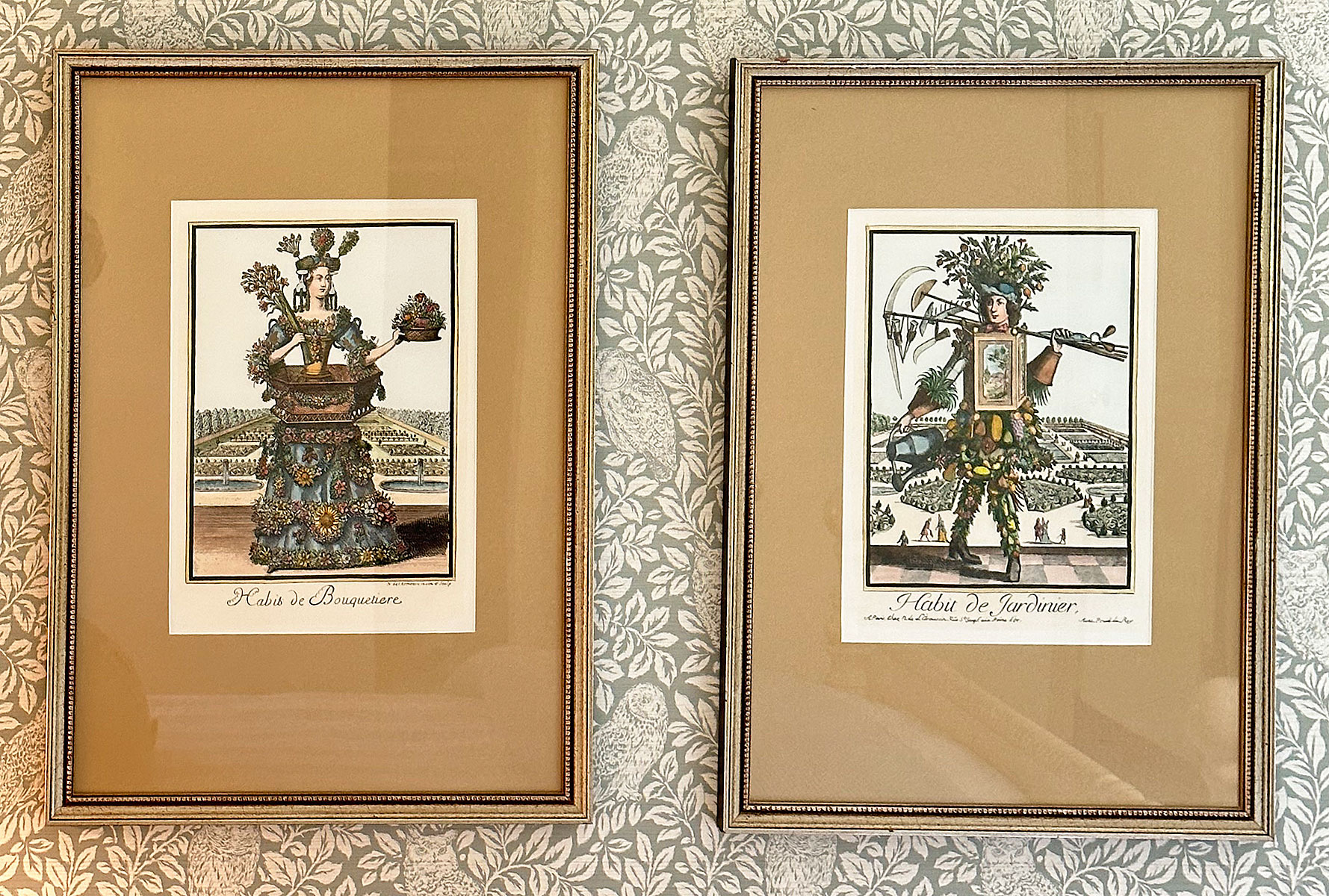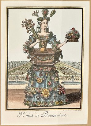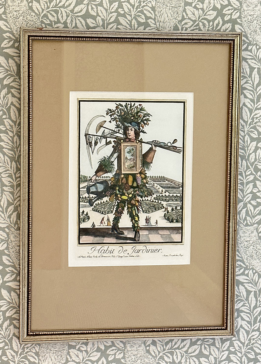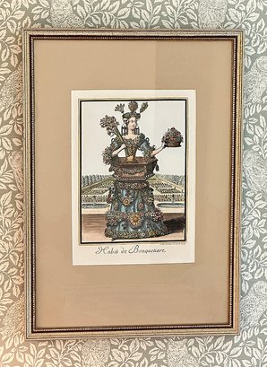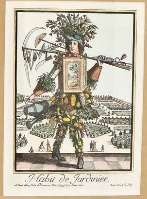 Pair Of Framed Colored Engravings From Les Costumes Grotesques Et Les Metiers. Habit de Jardinier, after Nicolas de Larmessin (1640-1725), from the series Les Costumes Grotesques et les Metiers published by Jacques Chiquet (1668-1721). Age if prints unknown. Nicely Framed. 19.5" x 27.7" (framed, each)