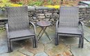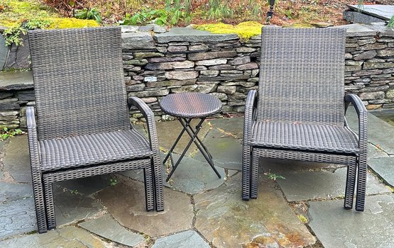 Pair Of Frontgate Sedona Convertible Chaise Loungers/Chairs. Can use as a chair, chaise, or lounger. With a side table. In a handwoven bronze resin wicker. The chairs are 27.5" wide and the table is 16" in diameter. In Excellent Condition. The cost for the chairs were $2000 ($1000/ea).