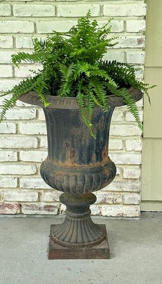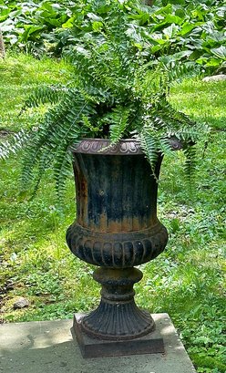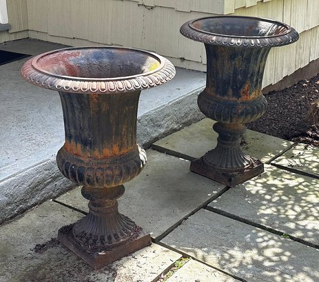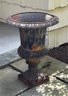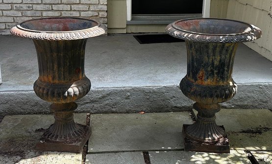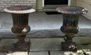 Pair Of Large Cast Iron Urn Planters. Some oxidtion. 30" Tall, 22" Diameter.