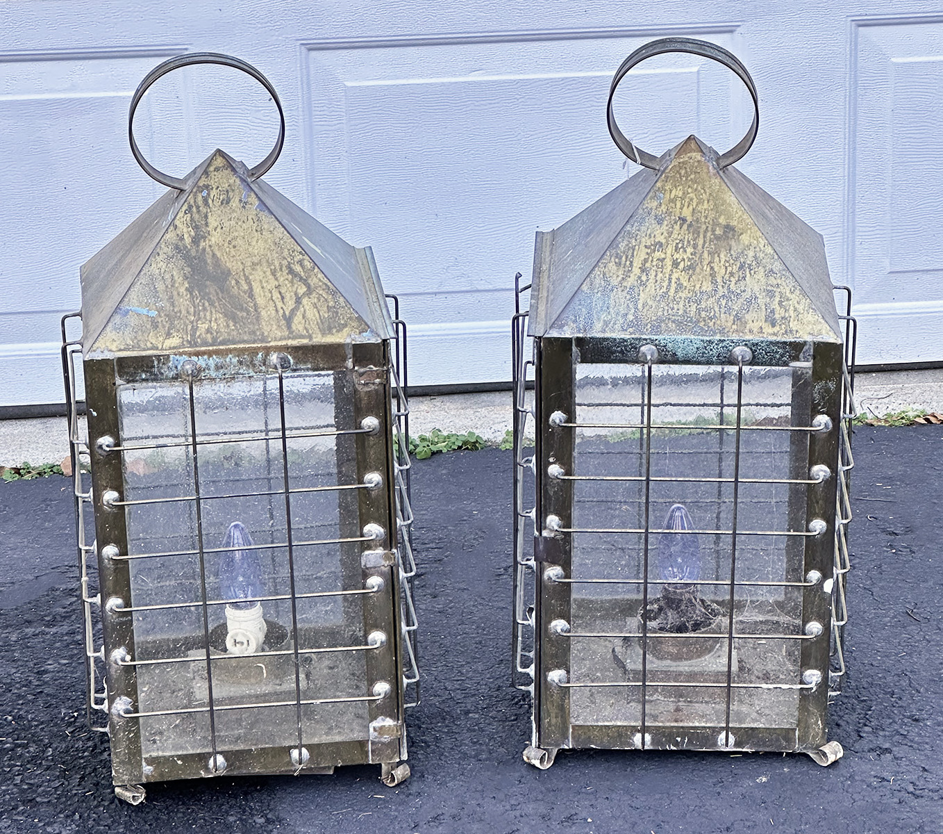 Pair Of Large Vintage Brass Electrified Lanterns. 26" Tall, 11" x 11". Some wear and tear; will look great with some cleaning and light repair.
