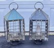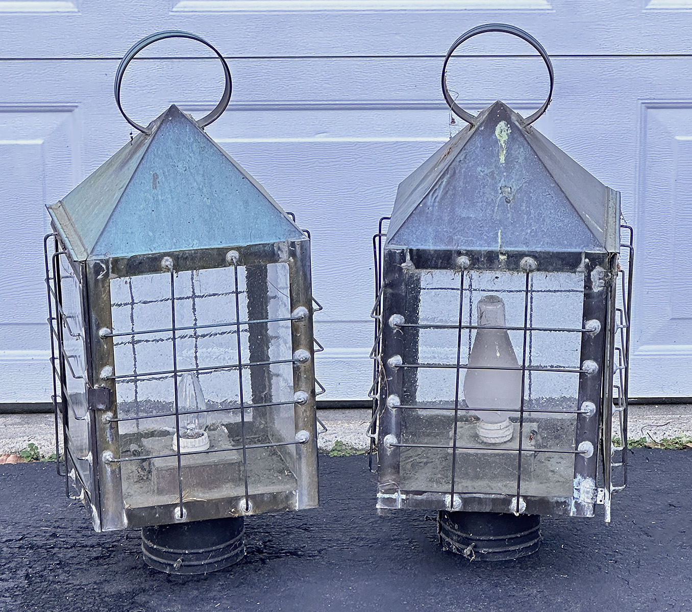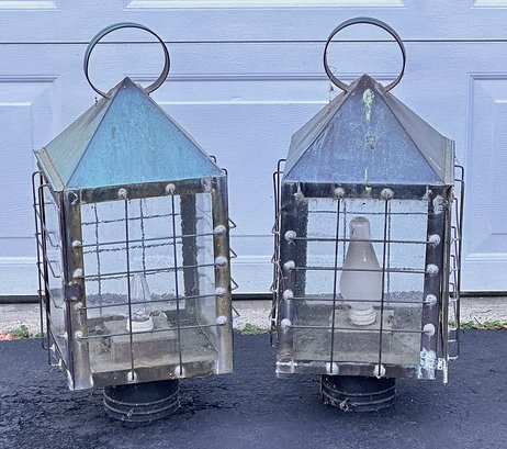Pair Of Large Vintage Brass Electrified Post Top Lanterns. 27" Tall, 12" x 12". Some wear and tear; will look great with some cleaning and light repair.