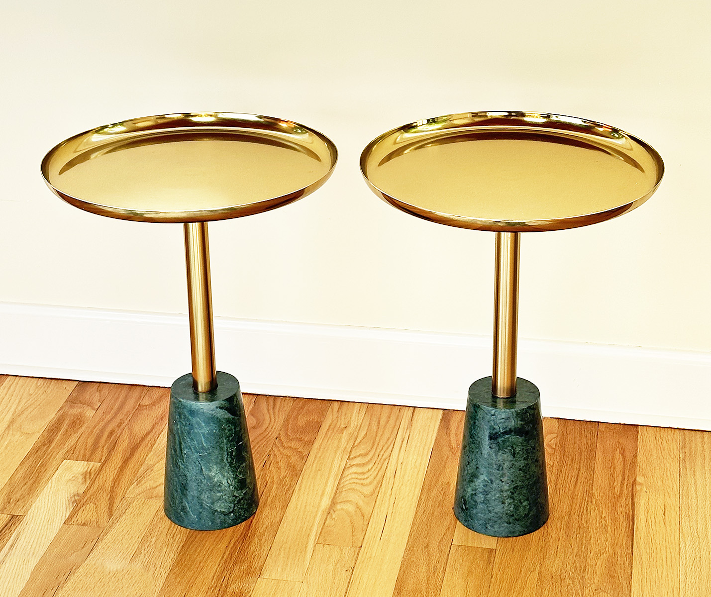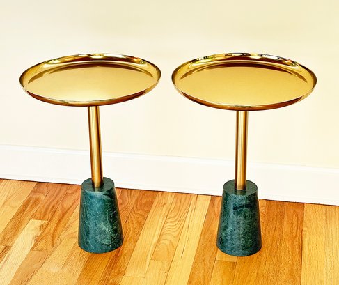 Pair Of Marble And Gold Metal Side Tables. Green marble bases. In Excellent Condition. 14.5"d x 20"h.