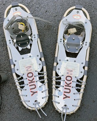 Pair Of Mountain Yukon 25" Snowshoes (8x25). Never Worn; with bag. The storage bag has some wear but the snowshoes are like new.