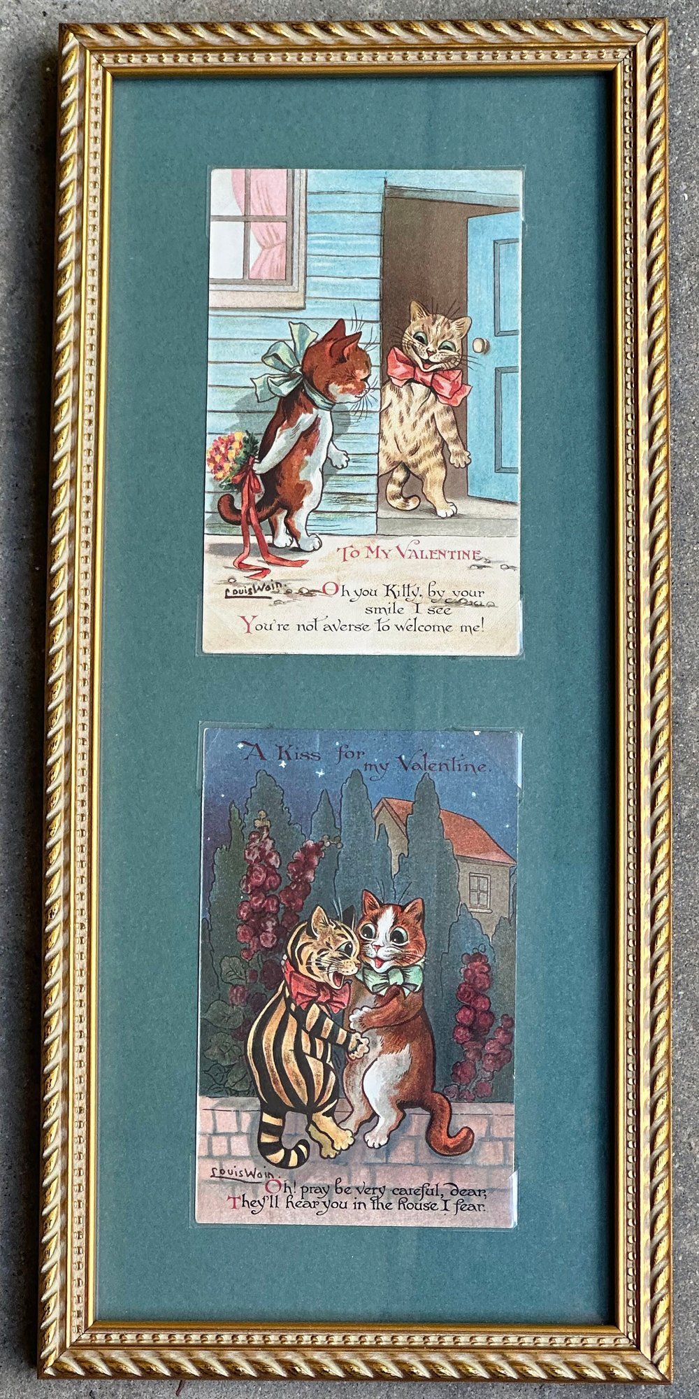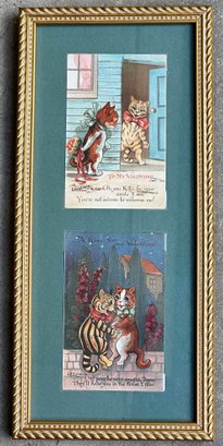 Pair Of Original Vintage Louis Wain Cat Themed Postcards - Professionally Framed. In Excellent Condition. Framed Dimensions: 7" x 15"