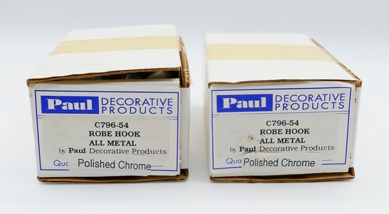 New In Box - Pair (2) Of Paul Decorative Products Robe Hooks (c796). In polished chrome. One of the hooks was removed from the box once for these photos. Luxury bathroom accessory. In New Condition. Please view our other Paul Decorative Bathroom Accessories on our auction.