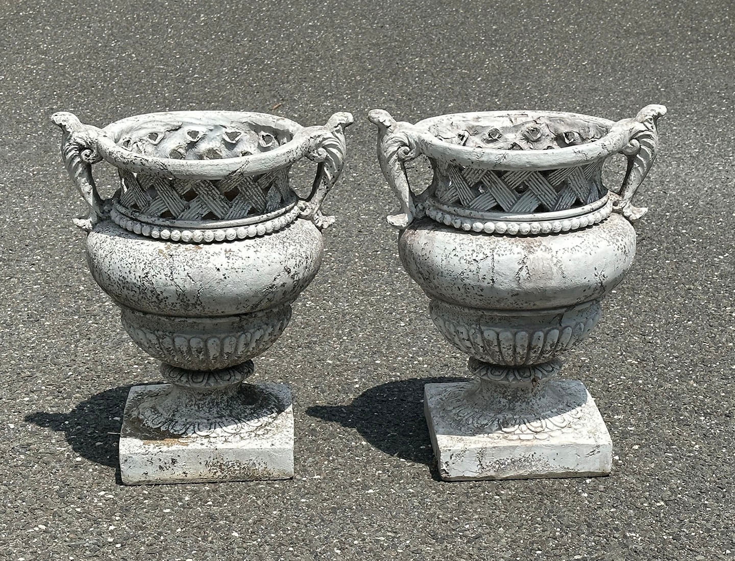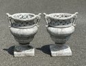 Pair Of Venezia Weave Firestone Urns / Planters. In A Distressed White Moss Finish. 12" W x 17" D x 21" H. Original Cost - $330/Ea ($660)
